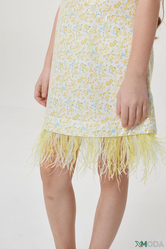 - Праздничный дизайн. Платье украшено блестящими пайетками с нежным цветочным принтом и игривыми перьями по подолу, что делает его по-настоящему нарядным и запоминающимся.