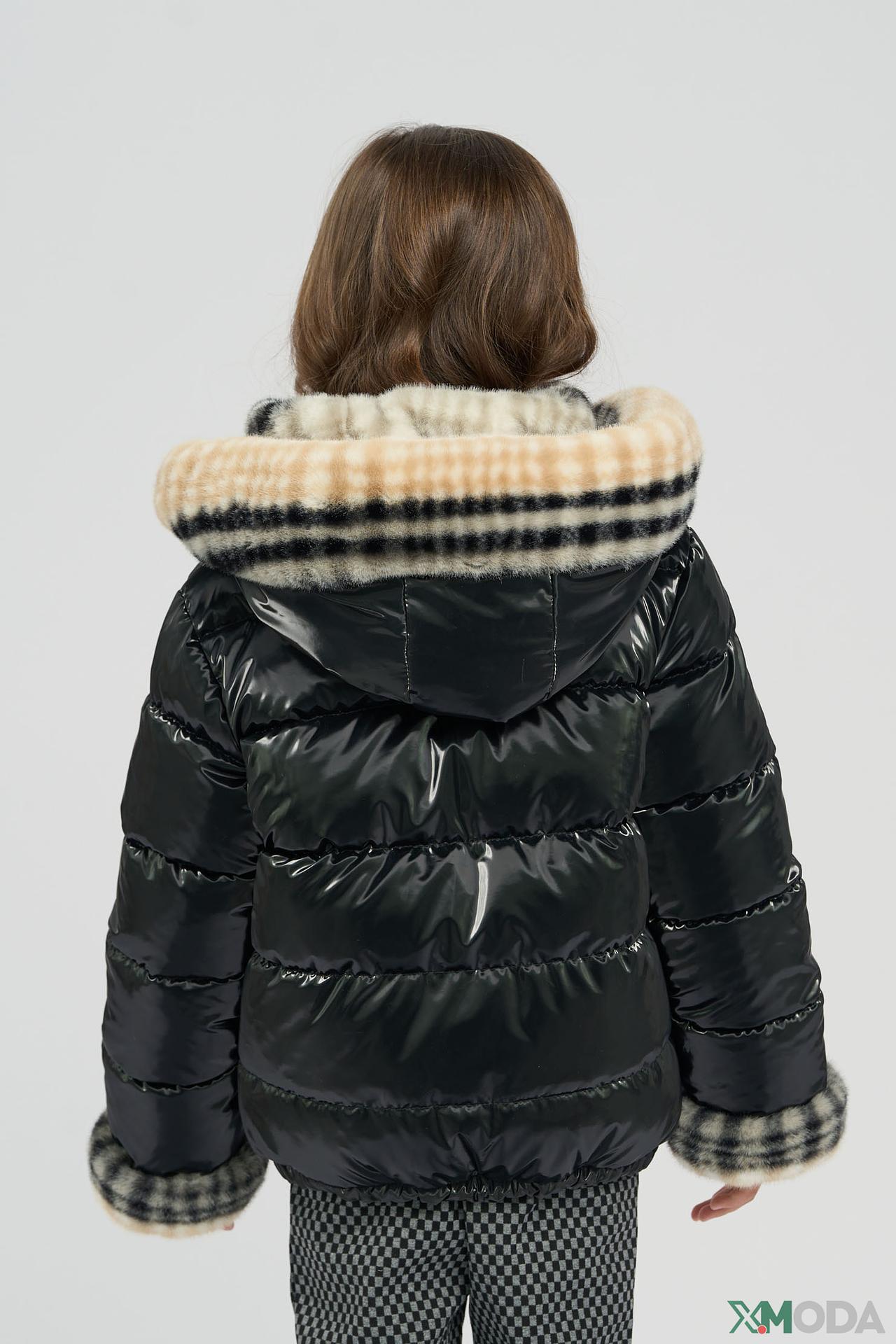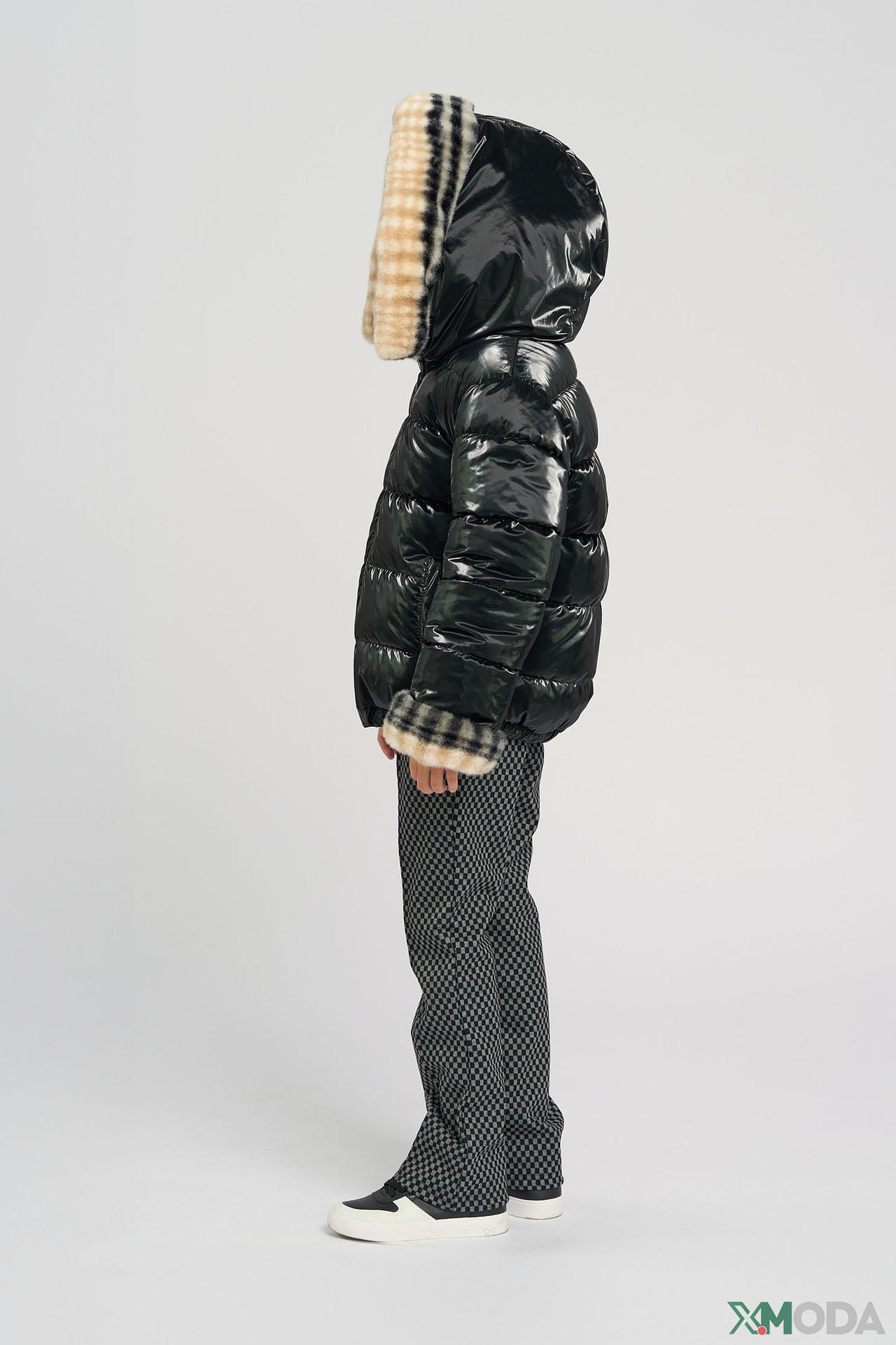 - Дизайн: Куртка двусторонняя. Одна сторона – глянцевая черная, вторая – мягкая плюшевая с контрастным клетчатым принтом. Меховая оторочка капююшона и манжет добавляет изделию изысканности.