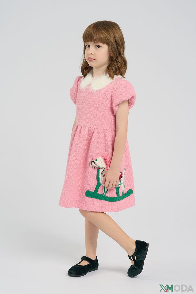Модель имеет короткие рукава и аккуратный воротничок, отделанный белым мехом, что делает образ более нарядным и милым. Передняя часть платья украшена яркой аппликацией в виде лошадки, которая обязательно понравится маленькой принцессе.