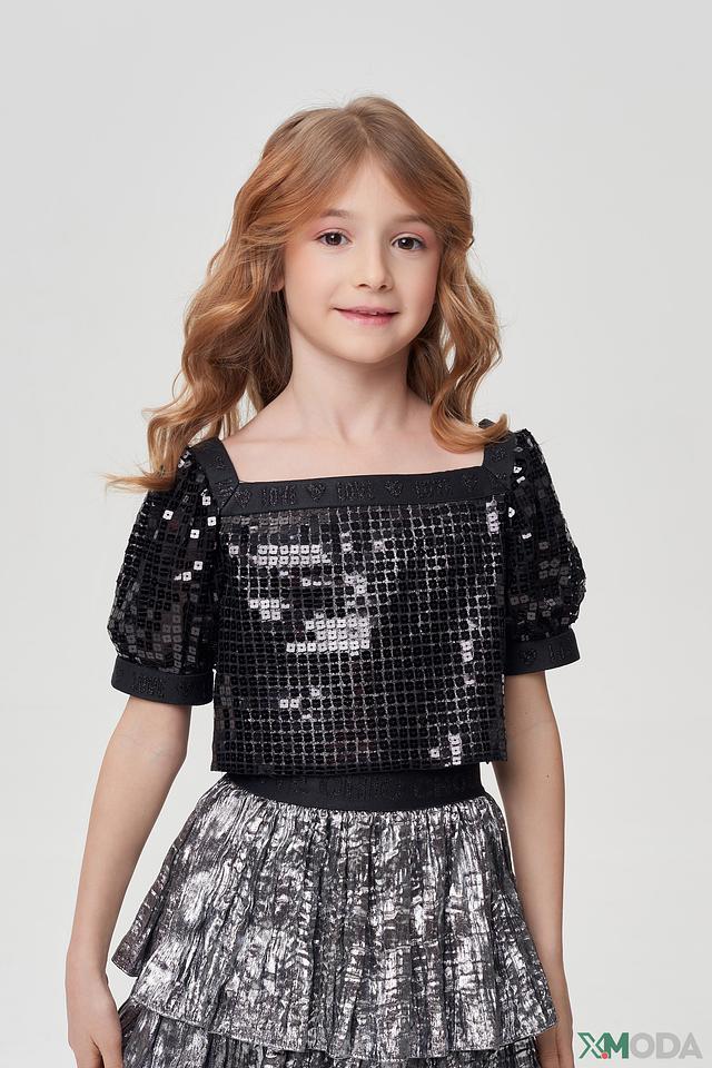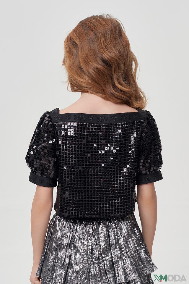 Эта очаровательная блуза от Choupette станет ярким акцентом в гардеробе юной модницы. Блуза выполнена в чёрном цвете и полностью покрыта сверкающими пайетками, что придает ей праздничный и нарядный вид.