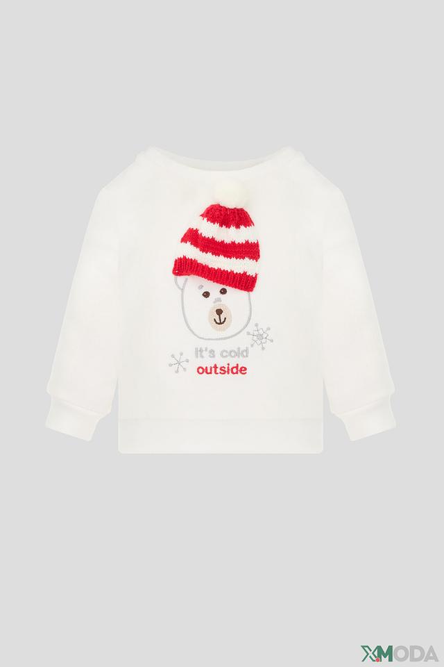 Кофта имеет круглый вырез горловины и длинные рукава, манжеты на рукавах и по низу кофты обеспечивают комфортную посадку. Передняя часть кофты украшена ярким принтом мишки в полосатой шапке и надписью “It’s cold outside”.