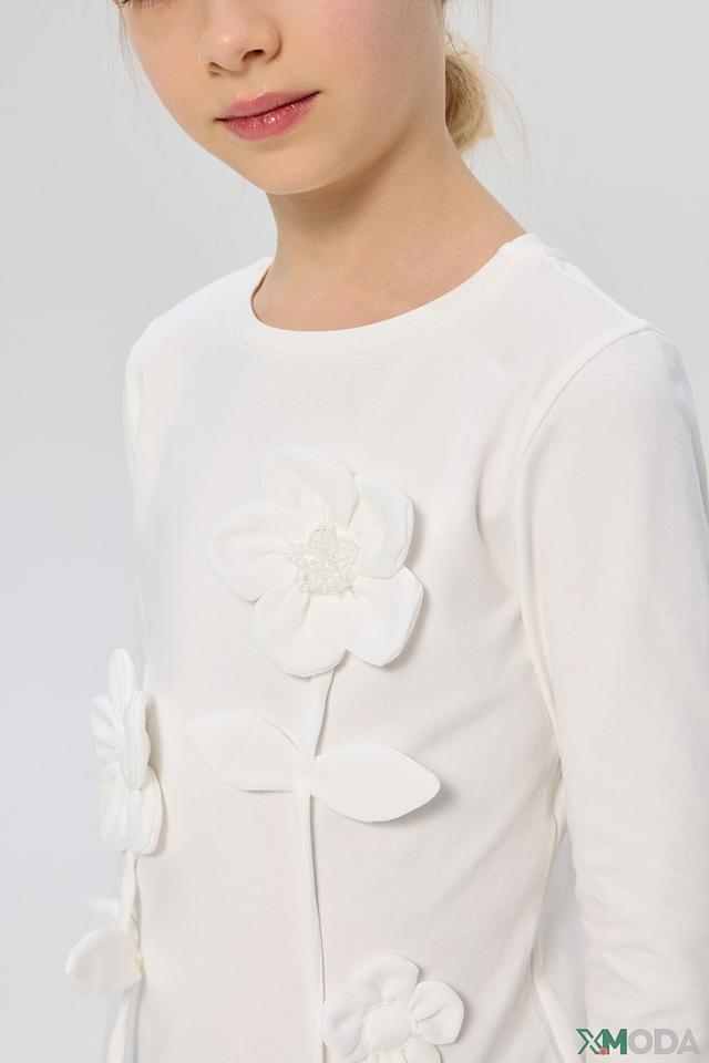 Основным акцентом модели являются объёмные, декоративные цветы, расположенные на лицевой стороне. Они придают образу нежность и романтичность. Футболка изготовлена из высококачественного хлопка (90%) с добавлением полиуретана (10%), что обеспечивает комфорт при носке, мягкость и хорошую посадку по фигуре.