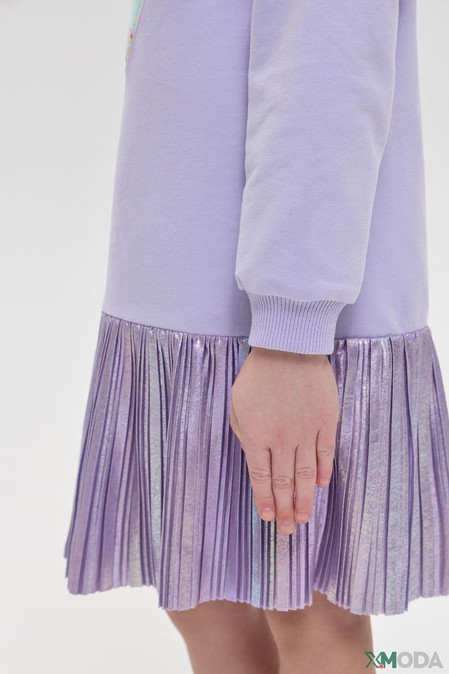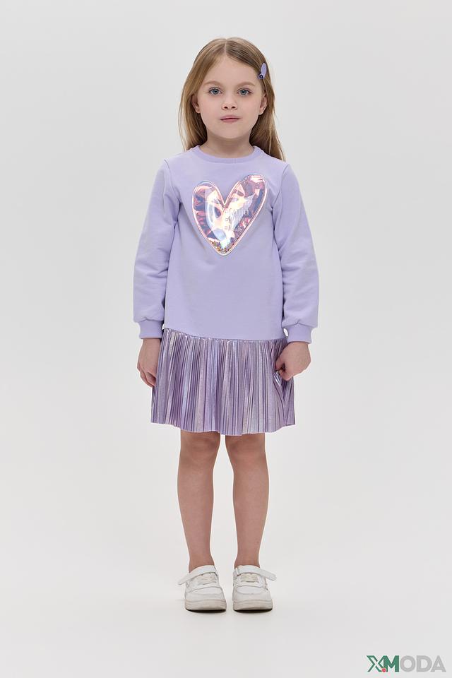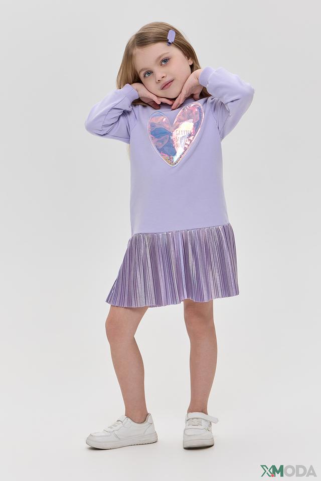 Верх платья – это уютный лонгслив, украшенный аппликацией в форме сердца с блестками. Плиссированная юбка добавляет образу игривости и легкости. Сочетание трикотажа и плиссе создает интересный контраст текстур.