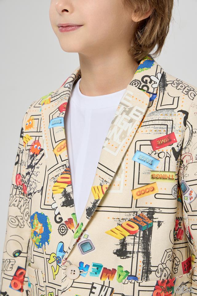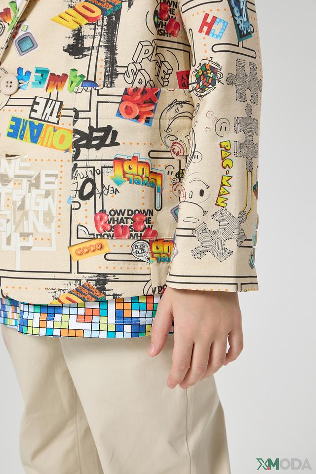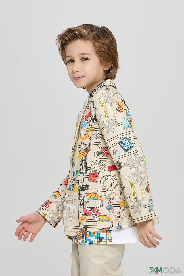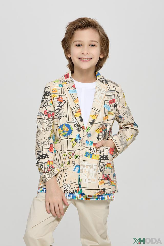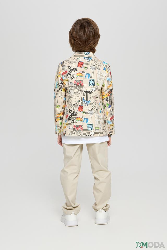 Этот стильный пиджак от Choupette станет ярким акцентом в гардеробе вашего мальчика. Пиджак выполнен в бежевом цвете и украшен красочным принтом с различными рисунками и надписями.
