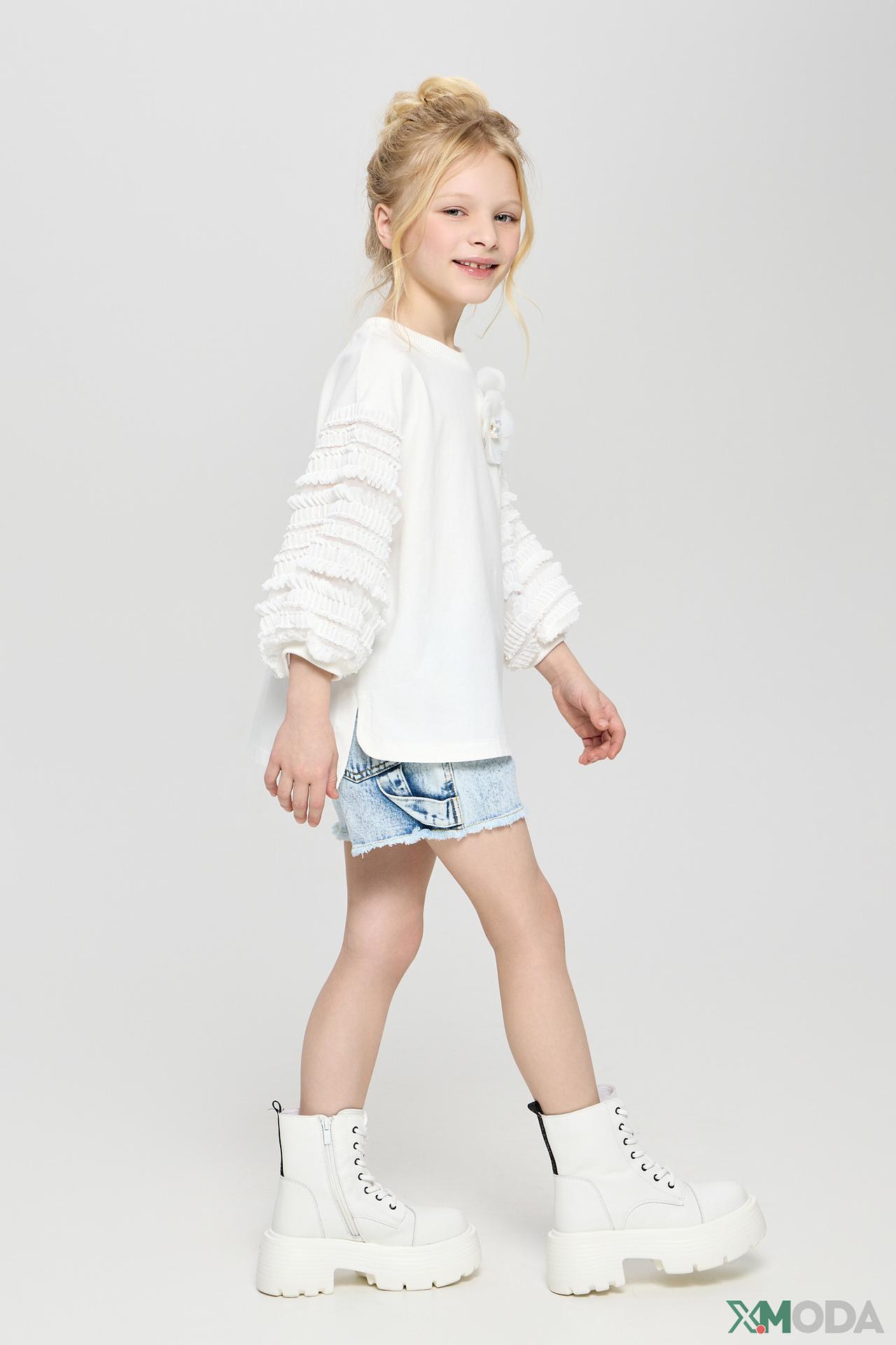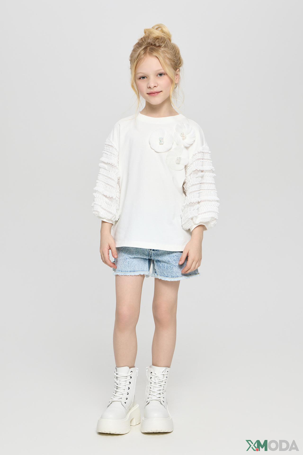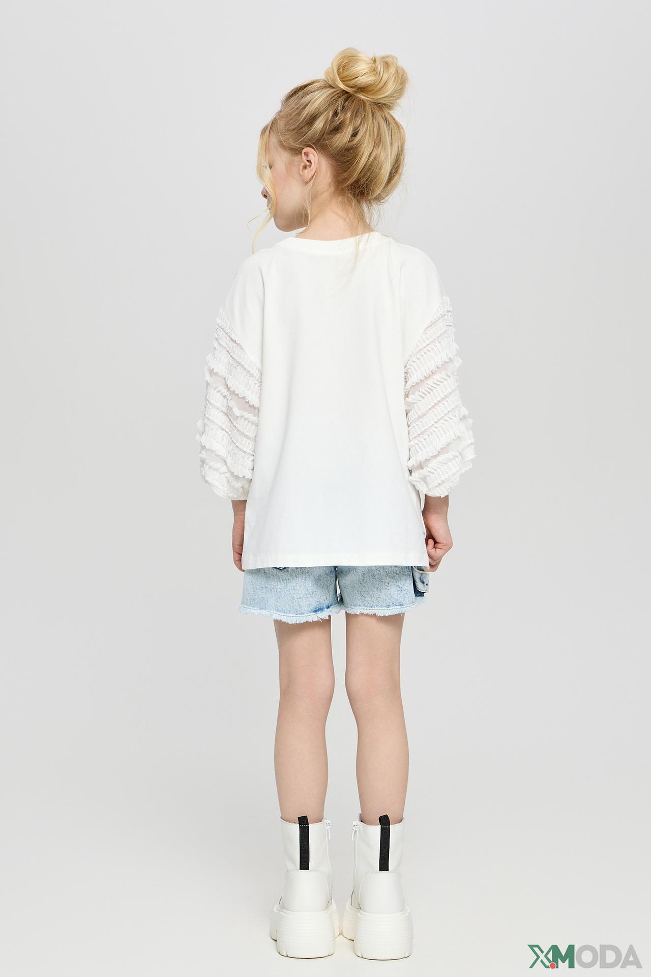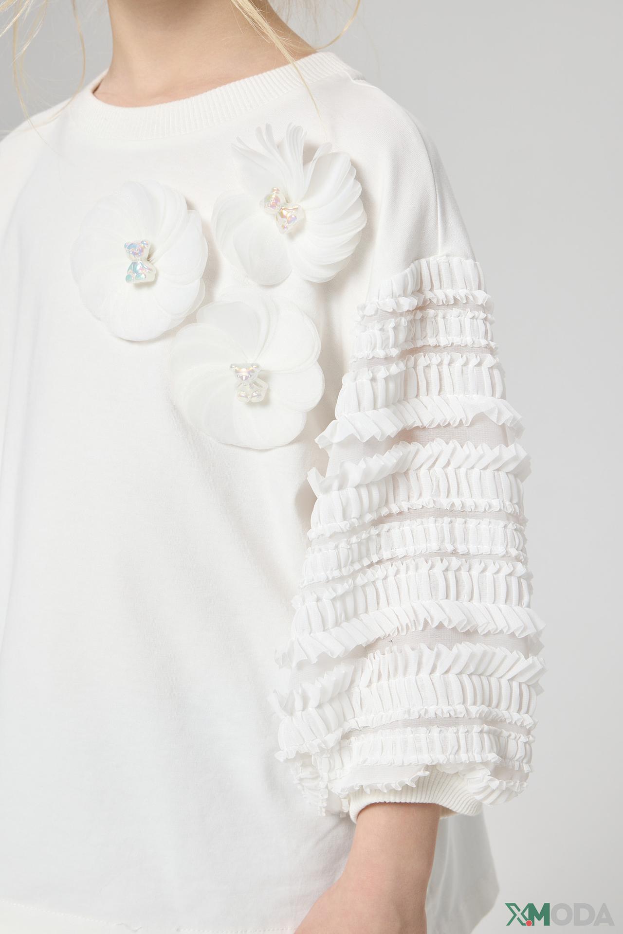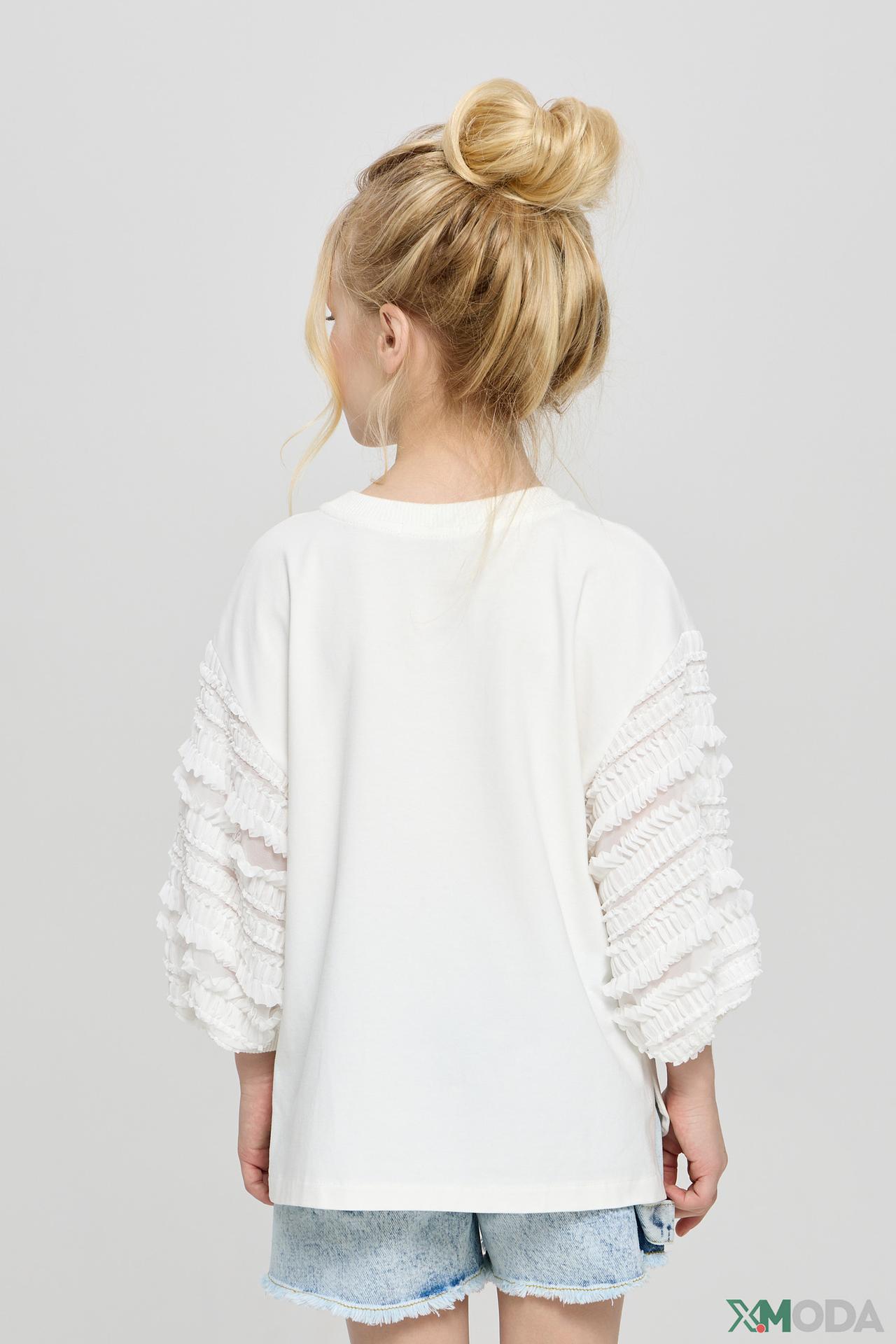 - Оригинальный дизайн – рюши на рукавах и декоративные элементы делают футболку неповторимой.