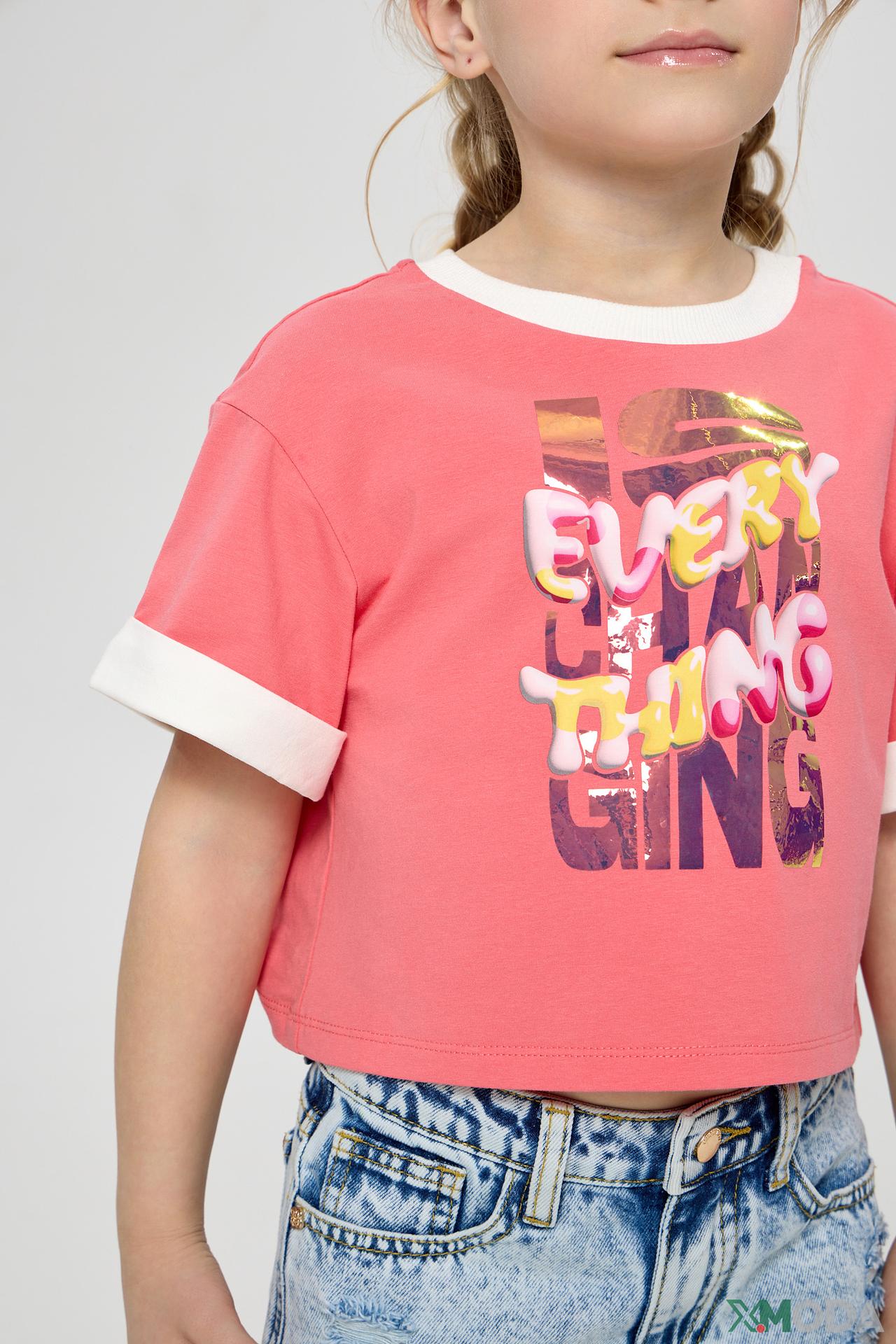 Модель выполнена из высококачественного хлопкового трикотажа с добавлением эластана (95% хлопок, 5% эластан), что обеспечивает максимальный комфорт и долговечность. Нежный красный оттенок в сочетании с яркой многоцветной надписью делает эту детскую футболку стильным акцентом любого образа.