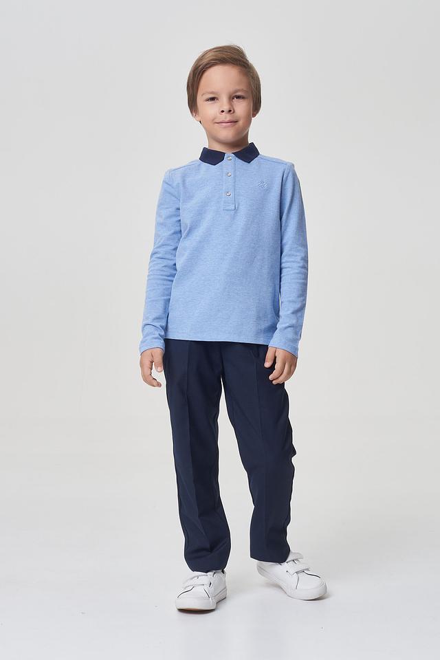 Поло имеет классический крой с длинными рукавами, что делает его подходящим для прохладной погоды. Голубой цвет изделия выглядит свежо и современно, а тёмно-синий воротник и планка с пуговицами добавляют контраста и стиля.