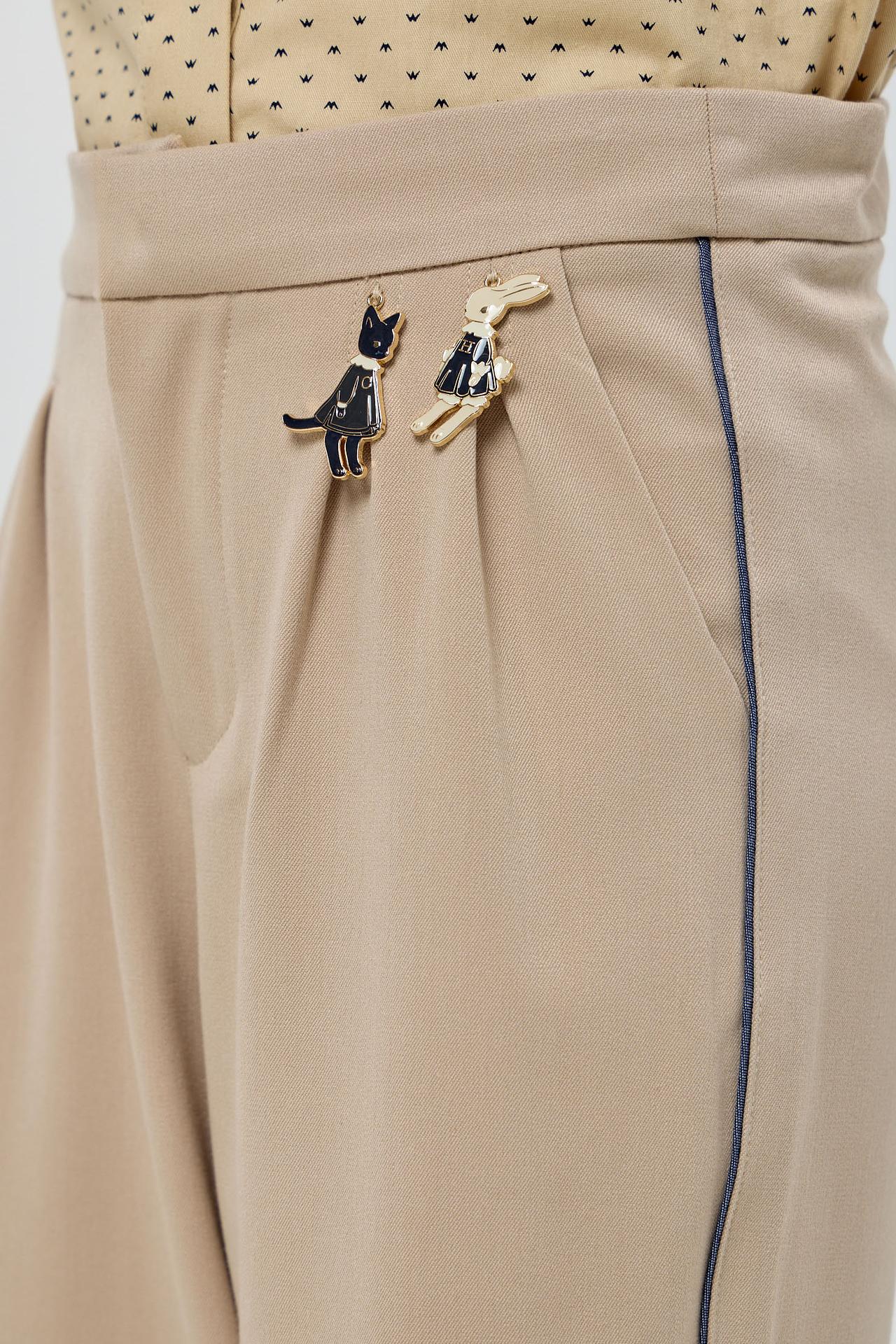 - Дизайн: Брюки имеют классический прямой крой, высокую посадку и элегантные стрелки. Контрастная отделка по боковым швам и очаровательные декоративные брелоки в виде животных придают изделию уникальность и делают его особенным.