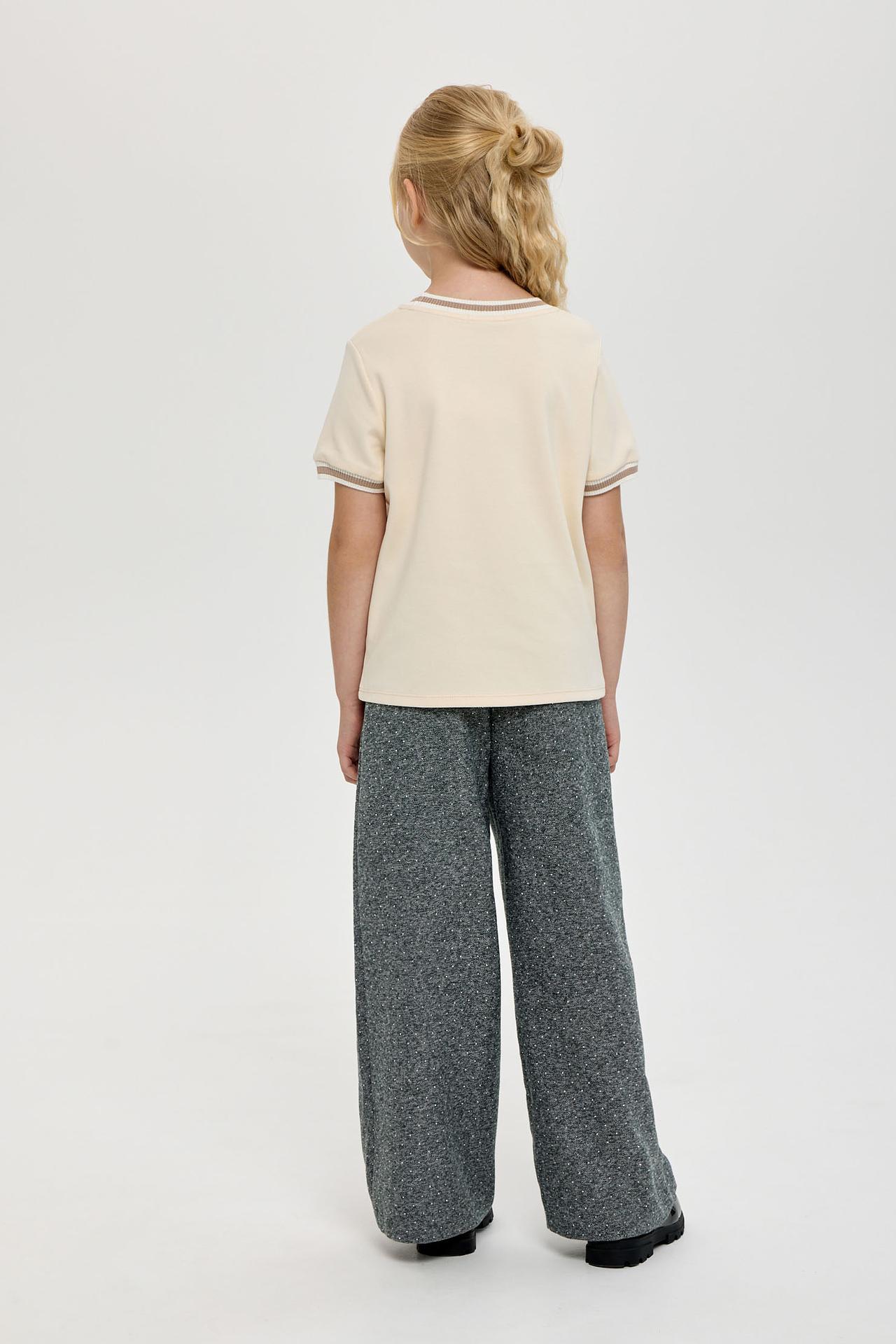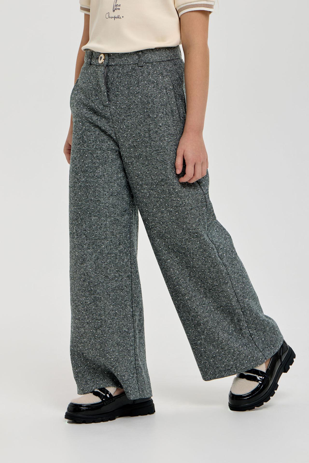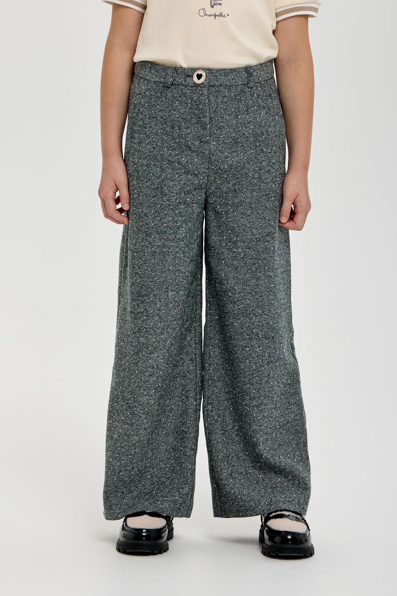 Брюки выполнены в актуальном фасоне палаццо, который подчеркивает изящество детской фигуры и соответствует последним модным тенденциям. Искрящиеся пайетки, деликатно вплетенные в ткань, добавляют изделию очарования и делают его по-настоящему особенным. Декоративная пуговица в виде сердечка на поясе придает дополнительный шарм.