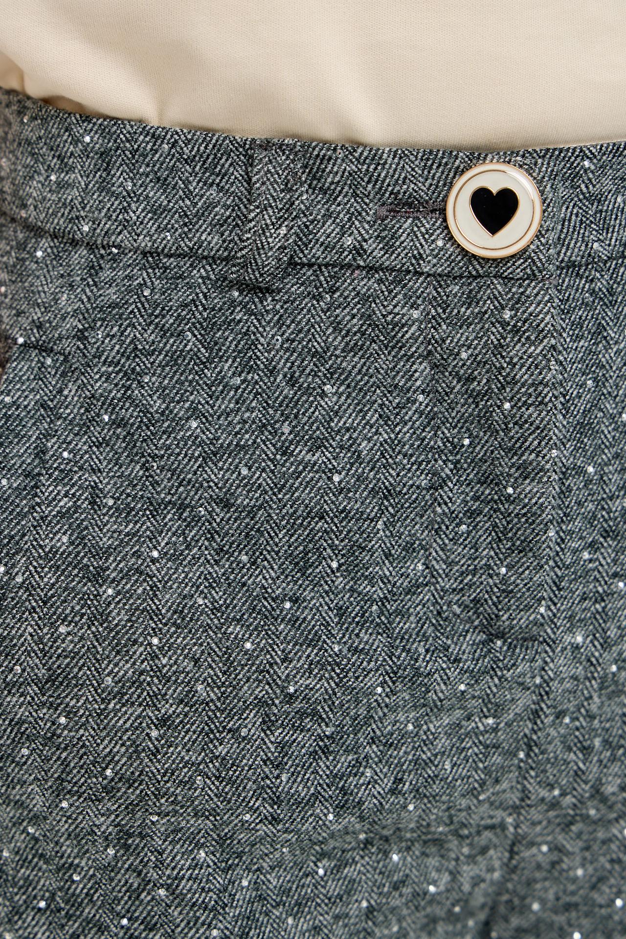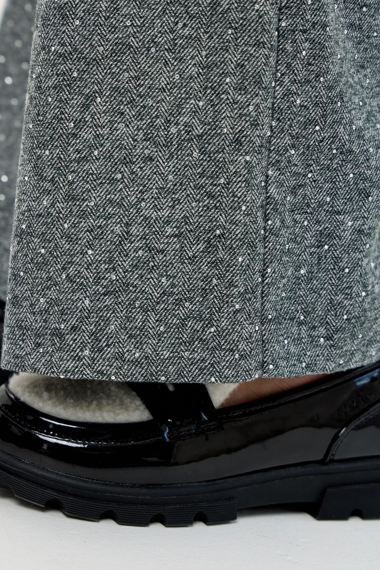 - Дизайн: Широкие брюки-палаццо с декоративной пуговицей в виде сердца. Мелкие серебристые пайетки по всей поверхности ткани создают эффект мерцания.