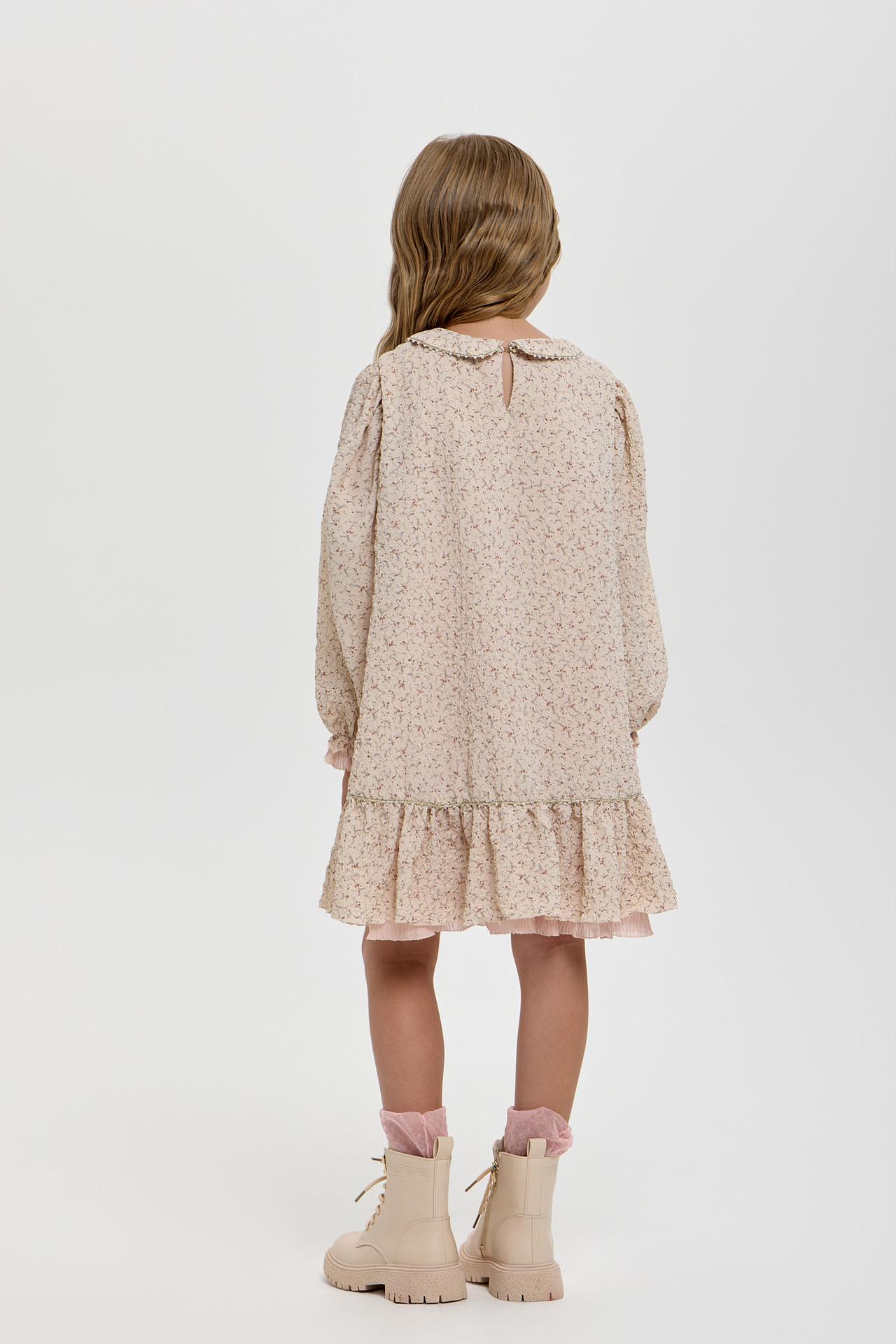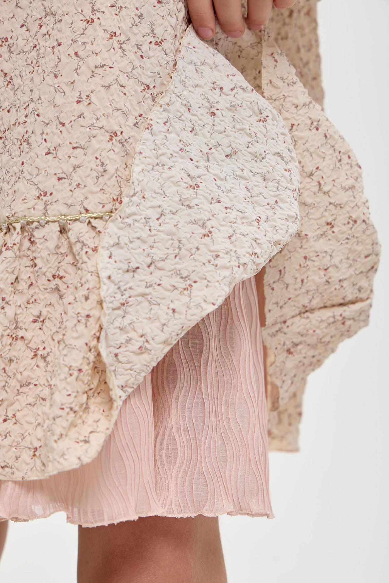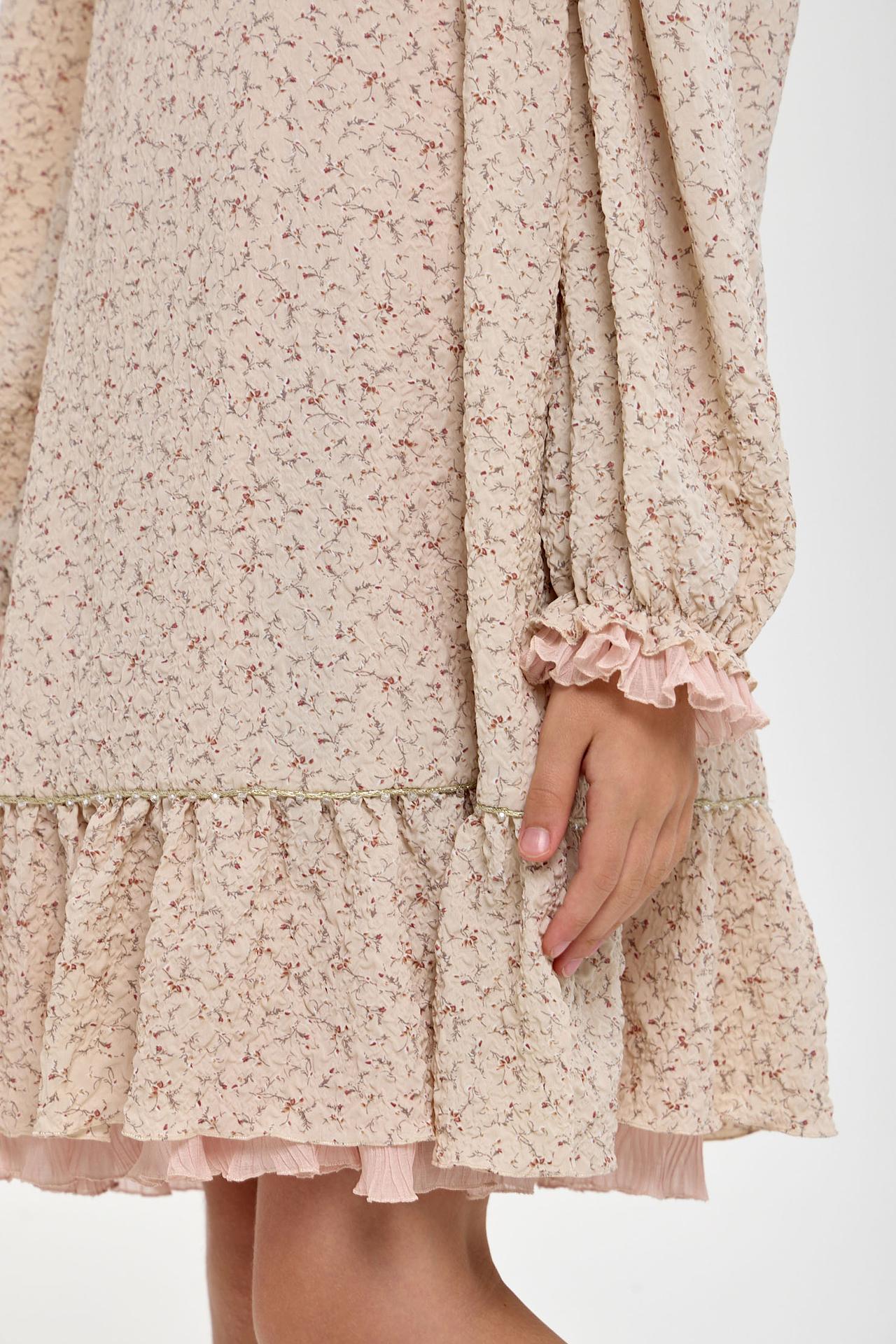 - Дизайн: Наряд украшен мелким цветочным принтом, напоминающим нежные полевые цветы. Воротник и манжеты декорированы изящными оборками, а по подолу платья проходит дополнительная оборка с тонкой золотистой тесьмой, добавляя изделию шарма.