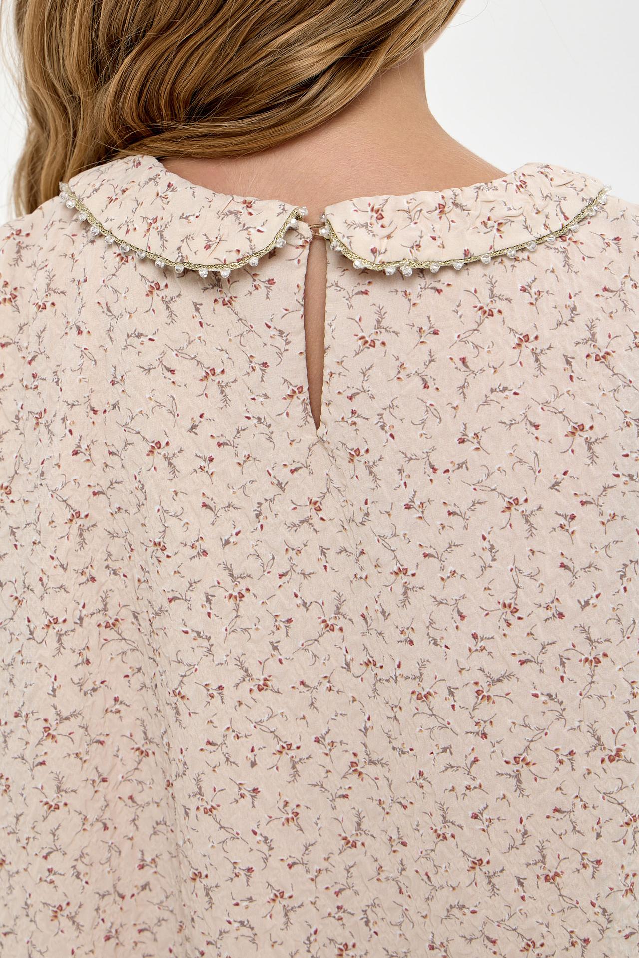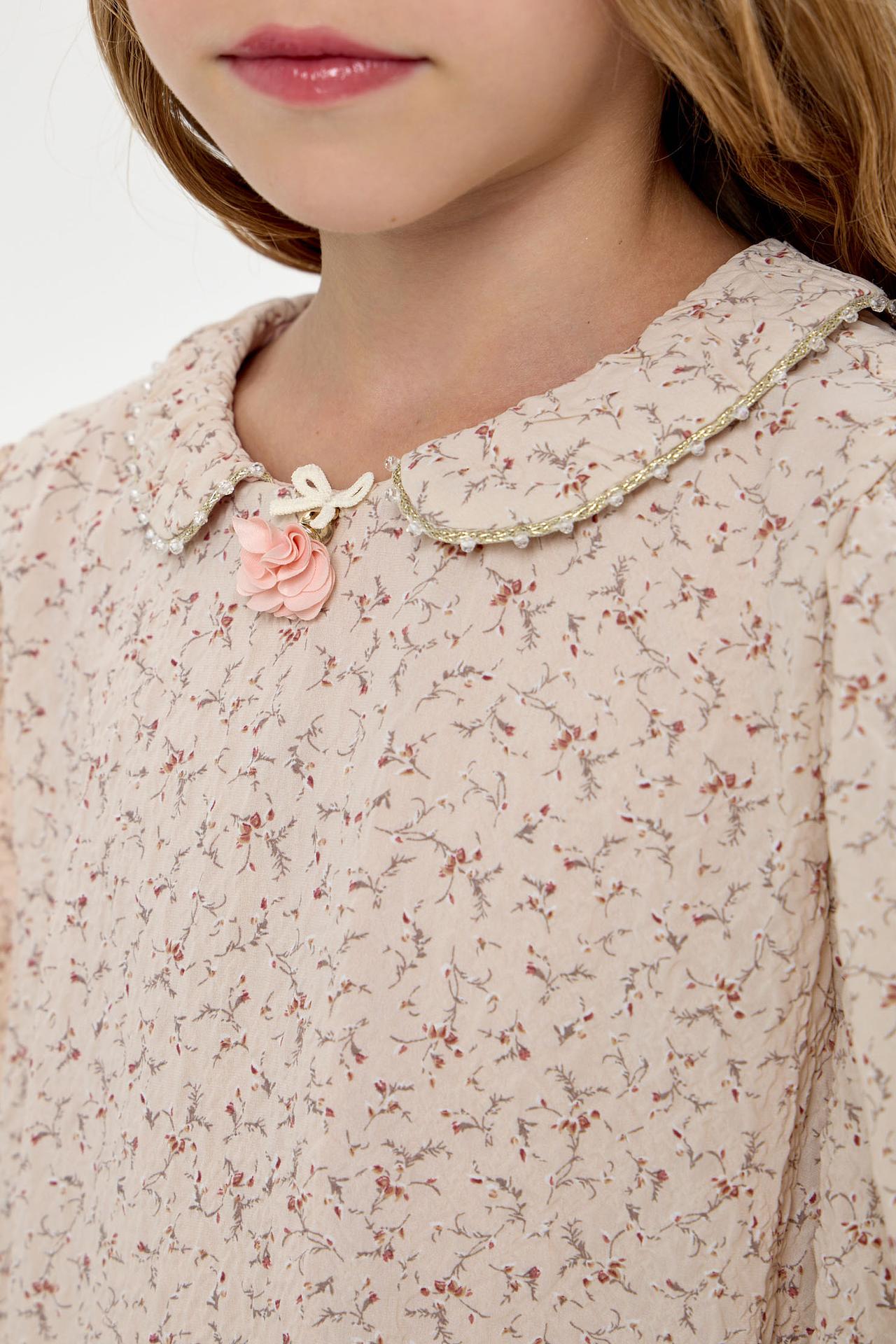 - Декоративные элементы: Изысканная брошь-цветок с бантиком на воротнике придает платью неповторимый шарм и делает его центром внимания. Мелкий жемчуг по краю воротника завершает элегантный образ.
