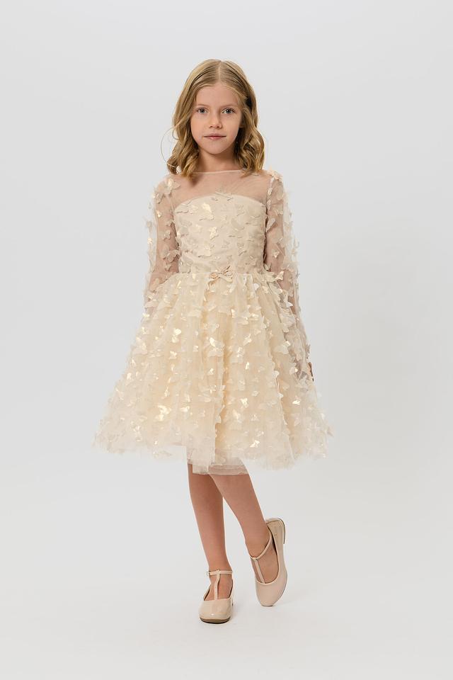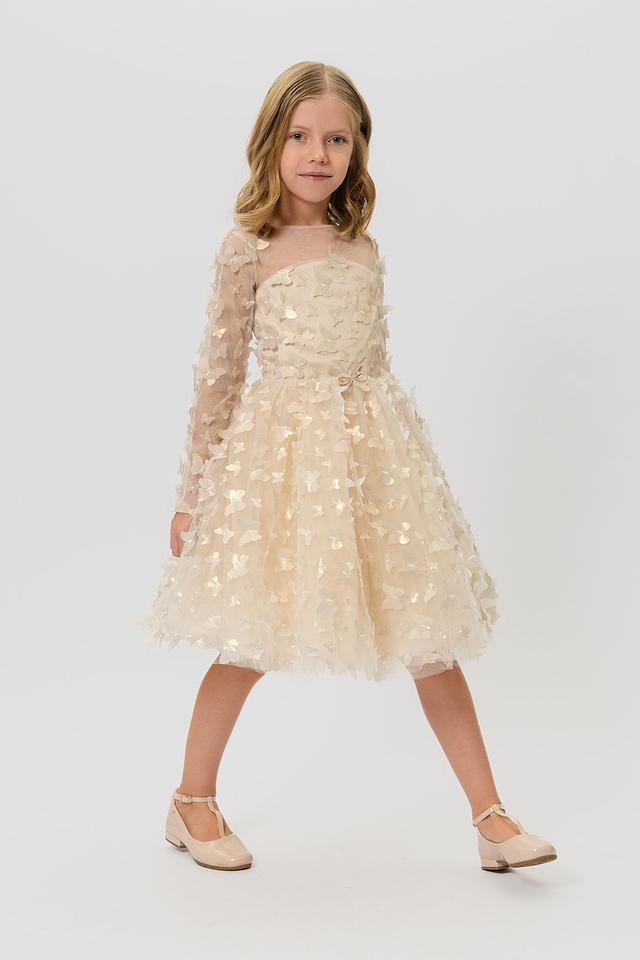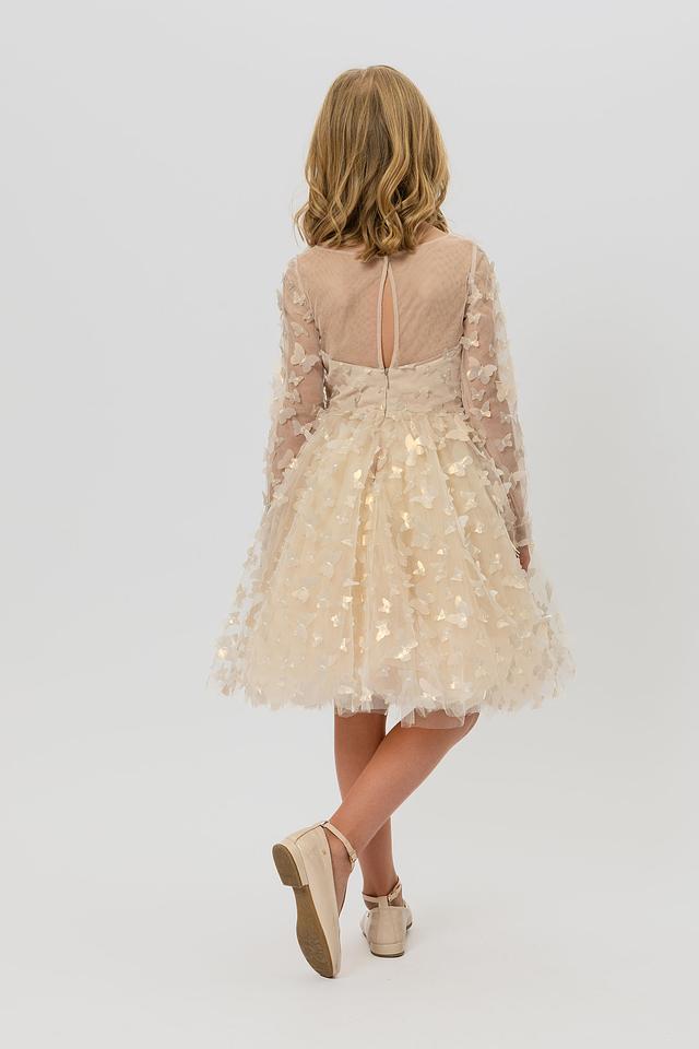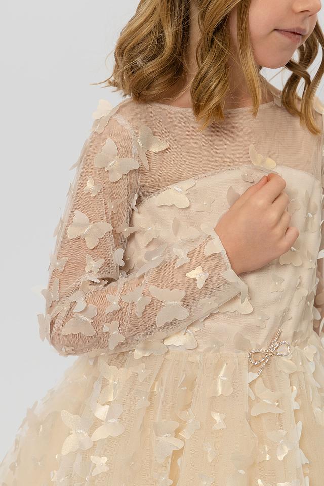 Модель имеет длинные рукава из полупрозрачной ткани, а также пышную юбку из фатина, украшенную теми же бабочками. Талия подчеркнута тонким поясом. Подкладка из 100% хлопка обеспечивает комфорт и приятные ощущения при носке.