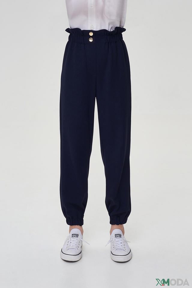 Брюки характеризуются высокой посадкой с широкой эластичной резинкой, декорированной двумя золотистыми пуговицами. Пояс обеспечивает комфортную посадку и подчеркивает талию. Широкие штанины, сужающиеся к низу на мягкой резинке, создают современный и расслабленный силуэт.