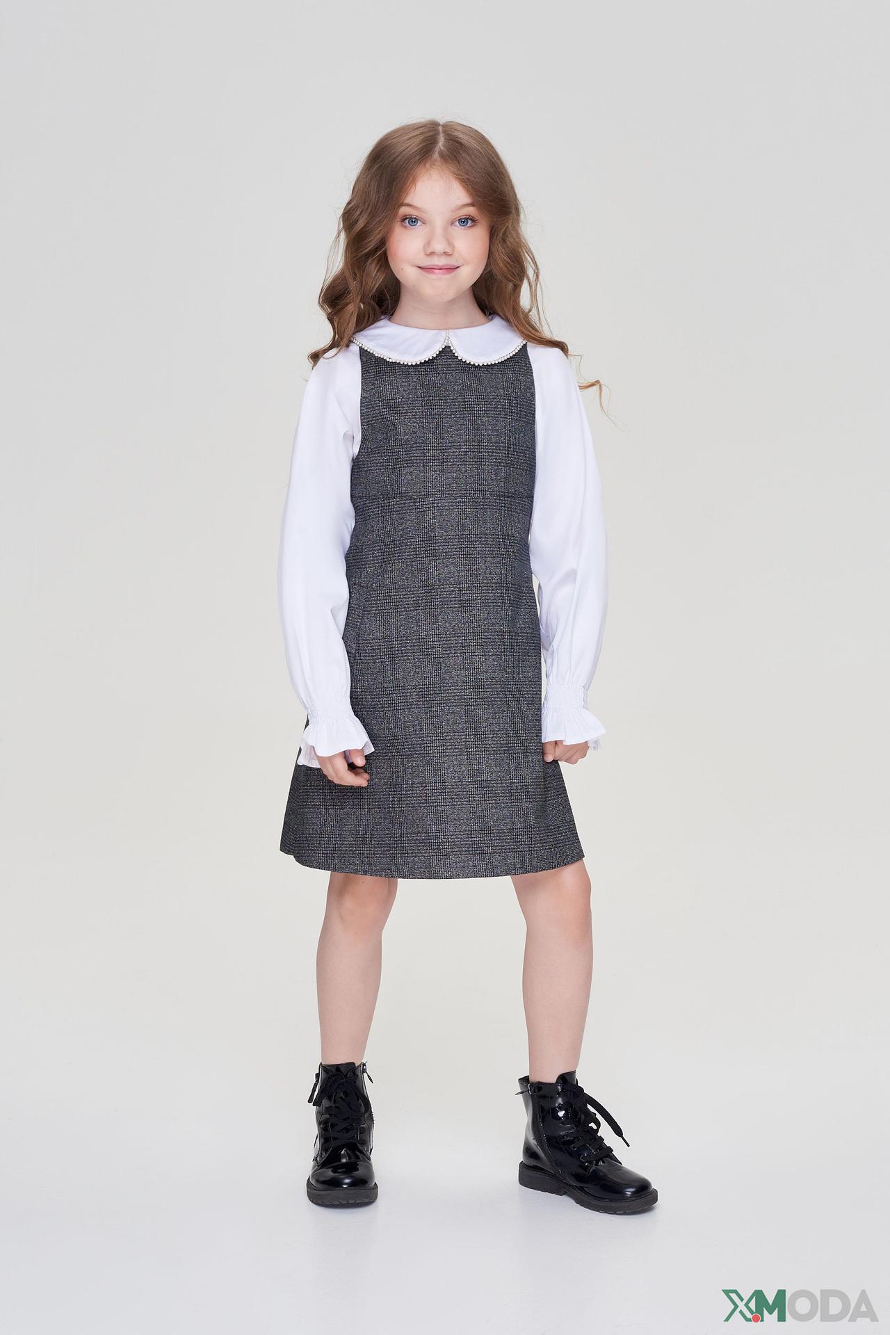 Платье-сарафан прямого кроя с круглым вырезом горловины. Отличительной деталью является съемный воротничок, который легко отстегивается для стирки или смены образа. На спинке предусмотрен декоративный бант.