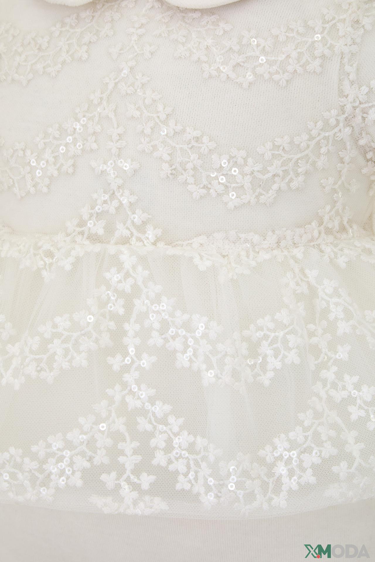 - Кружевные детали. Комбинезон декорирован изысканным кружевом, добавляющим наряду торжественности и элегантности.