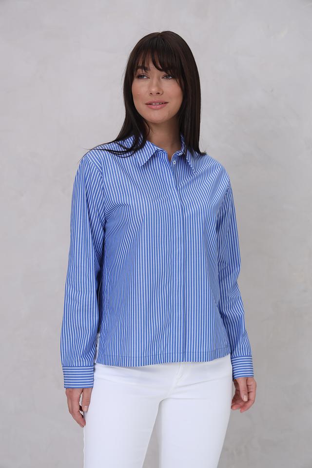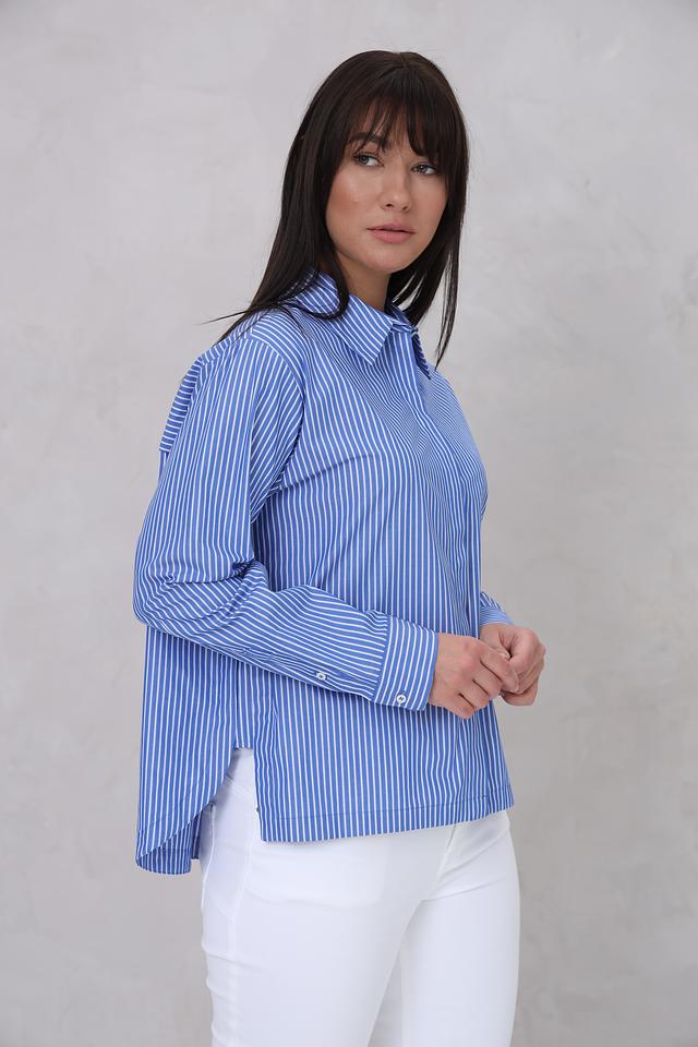 Женская рубашка Cinque голубого цвета в бело-голубую полоску. Модель выполнена из 100% хлопка, имеет длинный рукав и свободный крой. Состав: хлопок 100%