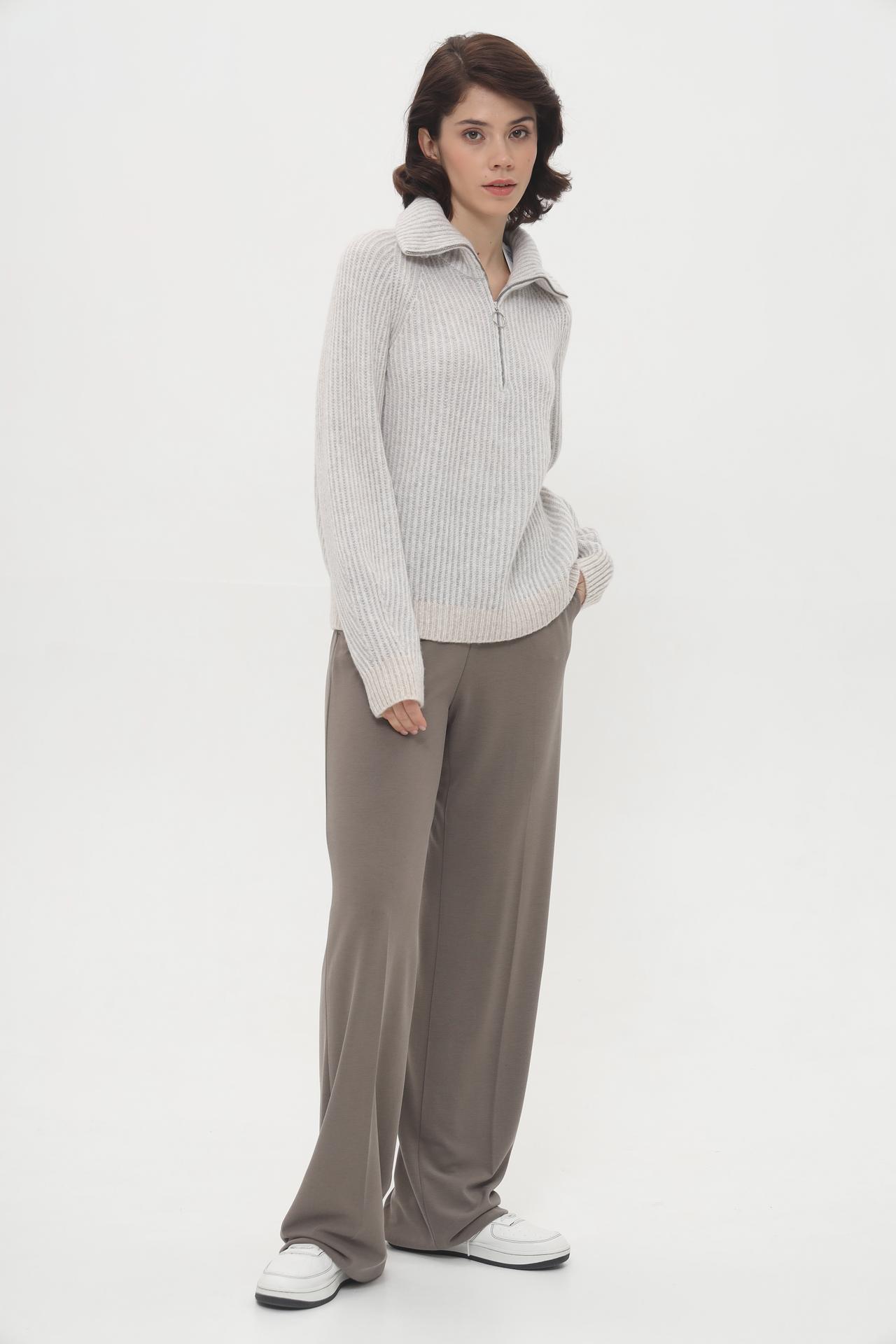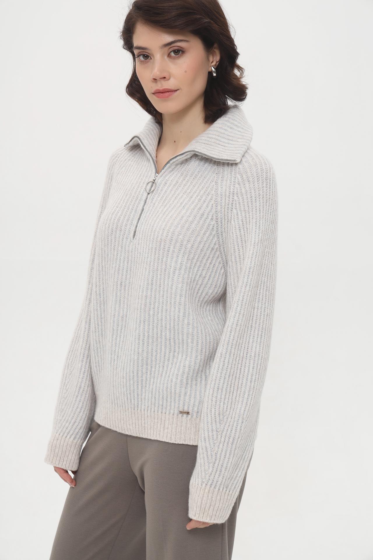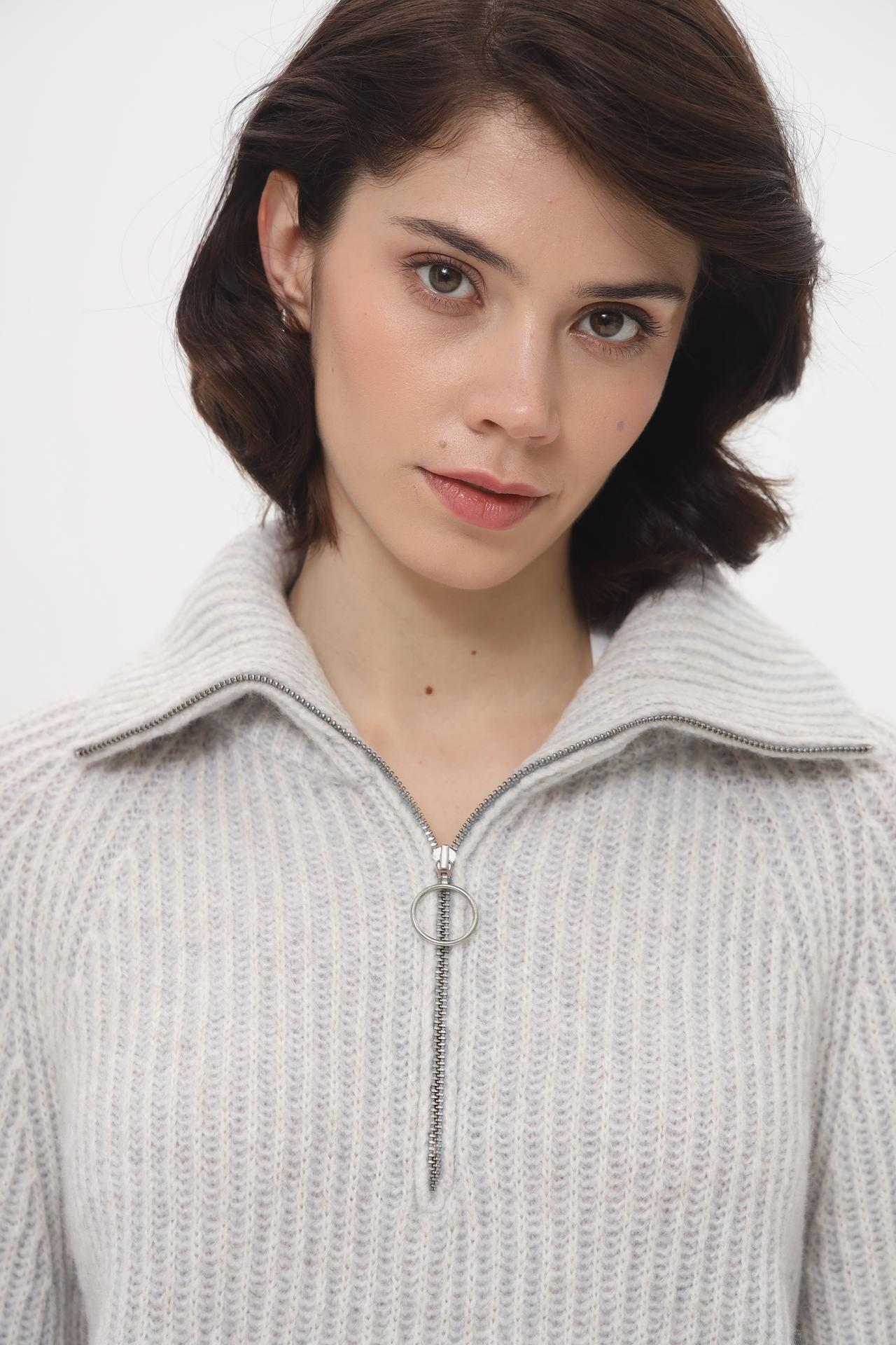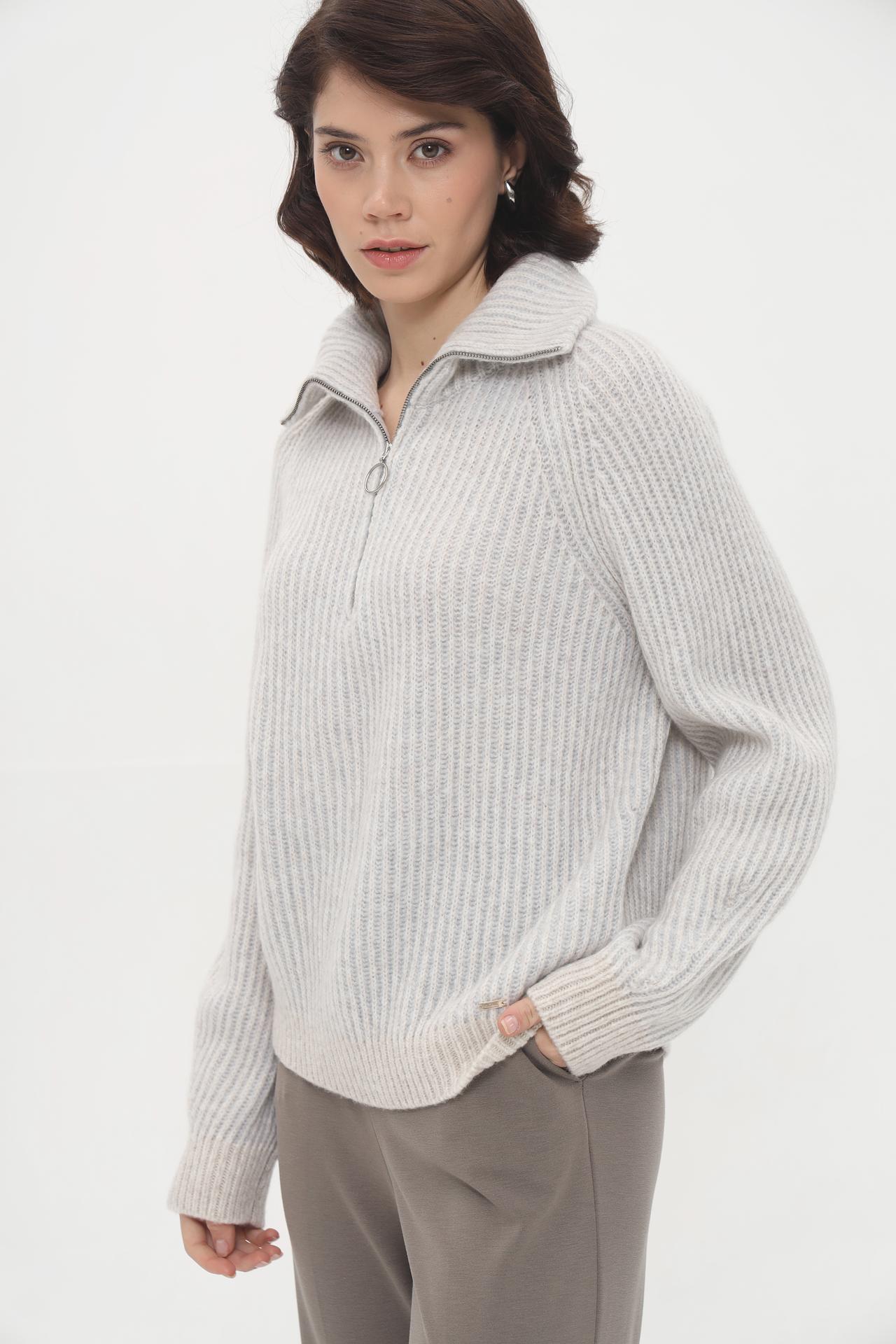 - Дизайн: Пуловер имеет удобный воротник-стойку и застежку-молнию, что позволяет регулировать степень теплоты. Вертикальная вязка визуально стройнит фигуру.