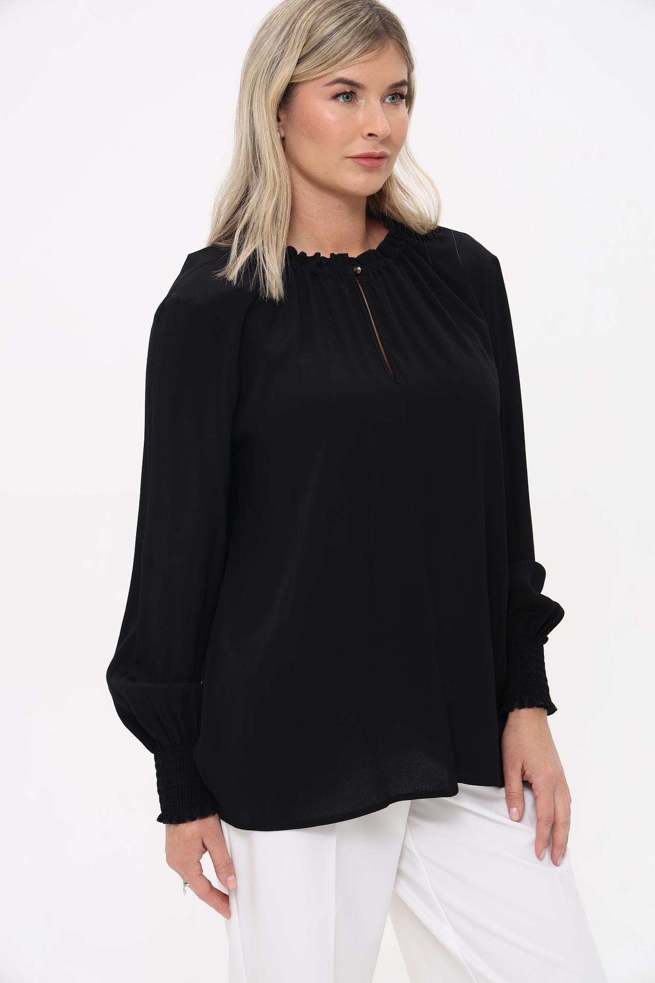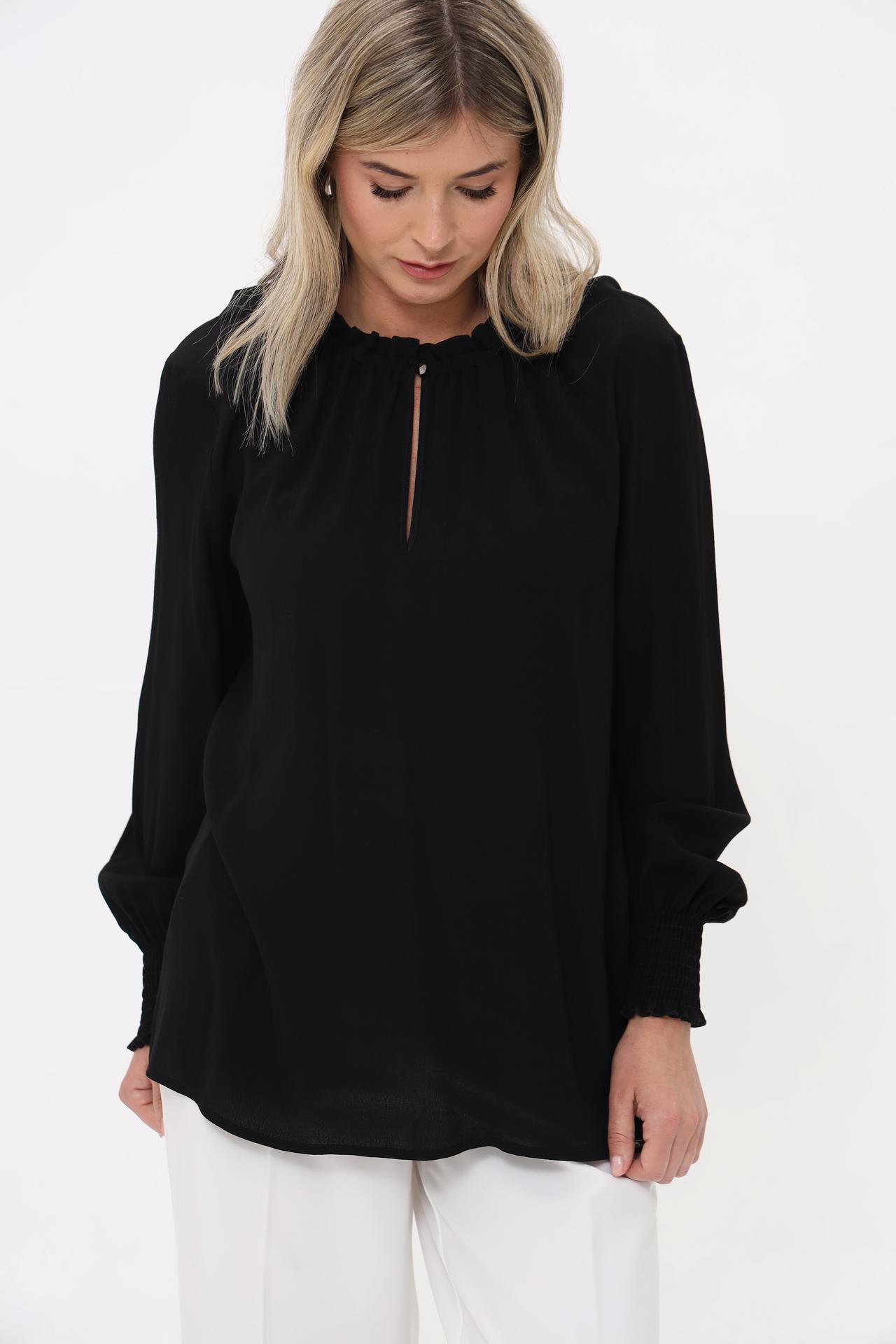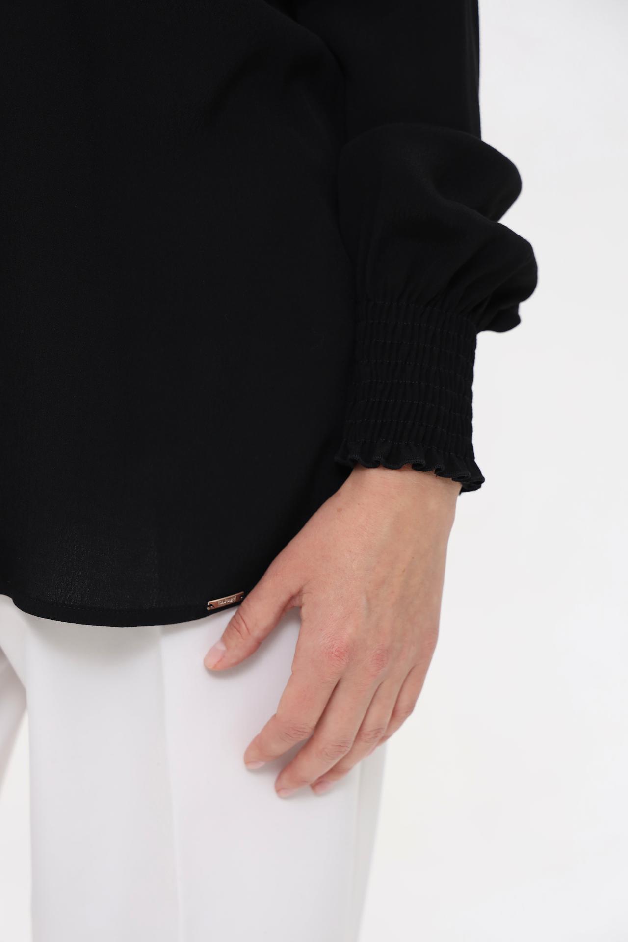 - Дизайн: Классический крой с высоким воротником, украшенным сборкой, и элегантным вырезом-каплей с пуговицей. Длинные рукава с манжетами на резинке добавляют образу утончённости.