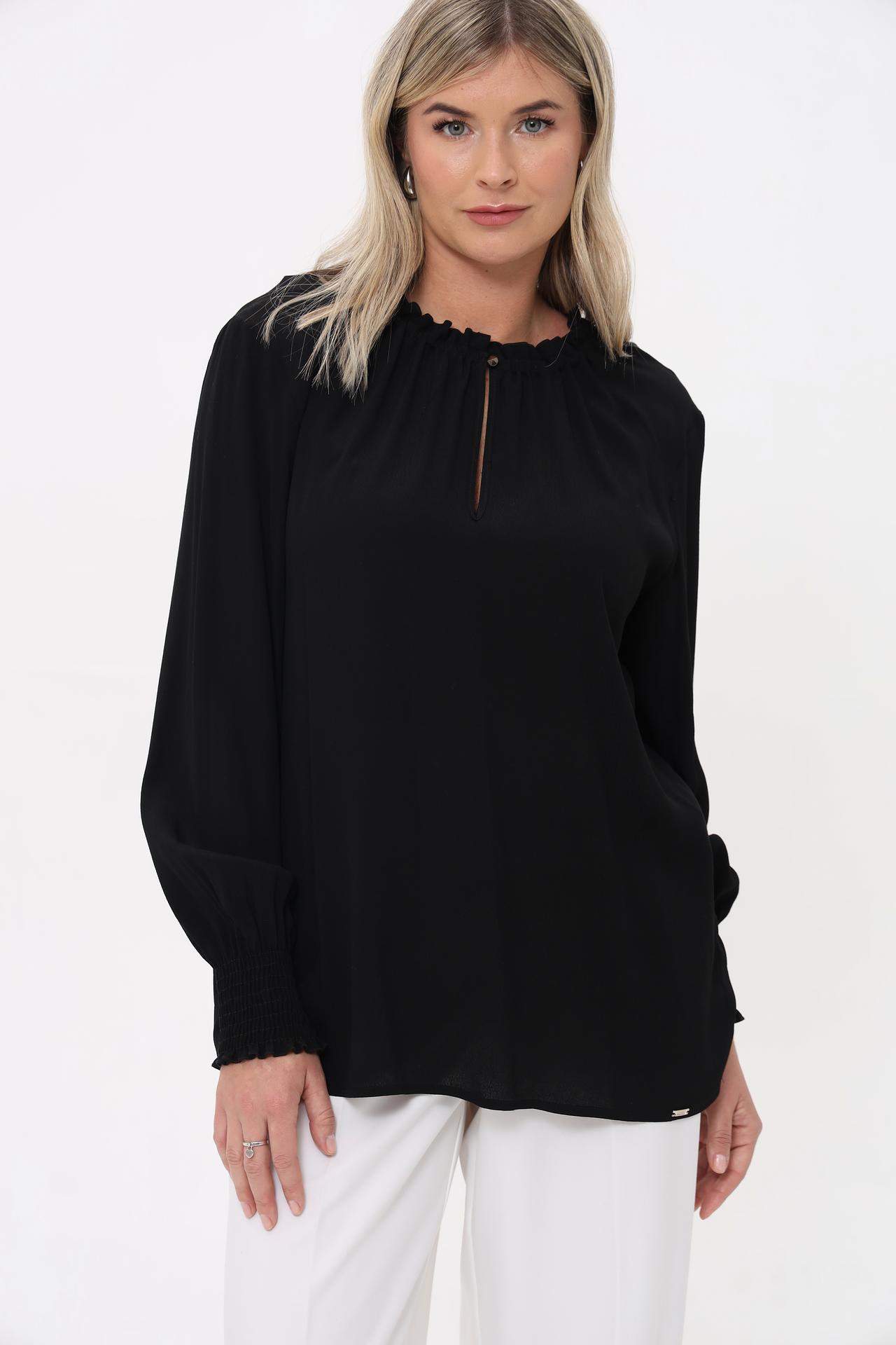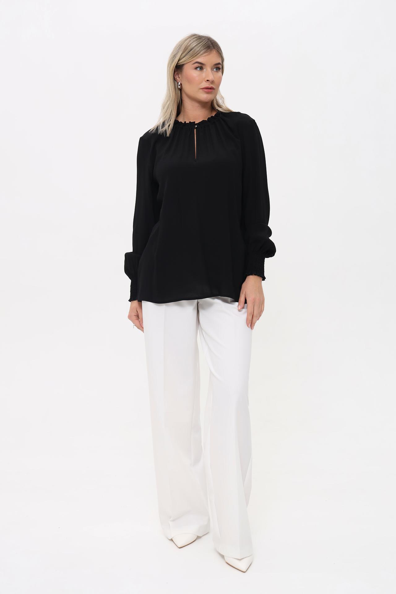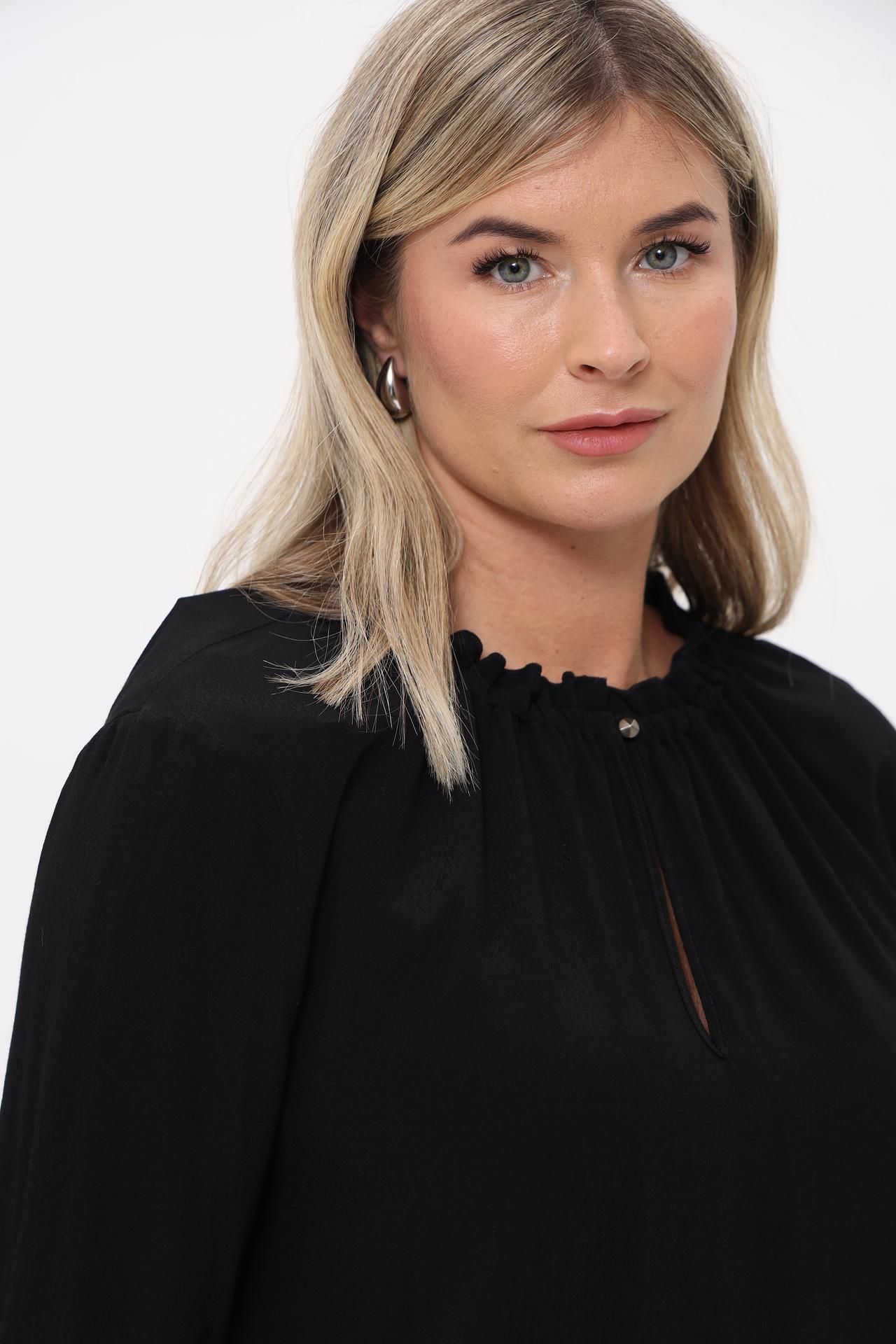 - Дизайн: Классический крой с высоким воротником, украшенным сборкой, и элегантным вырезом-каплей с пуговицей. Длинные рукава с манжетами на резинке добавляют образу утончённости.