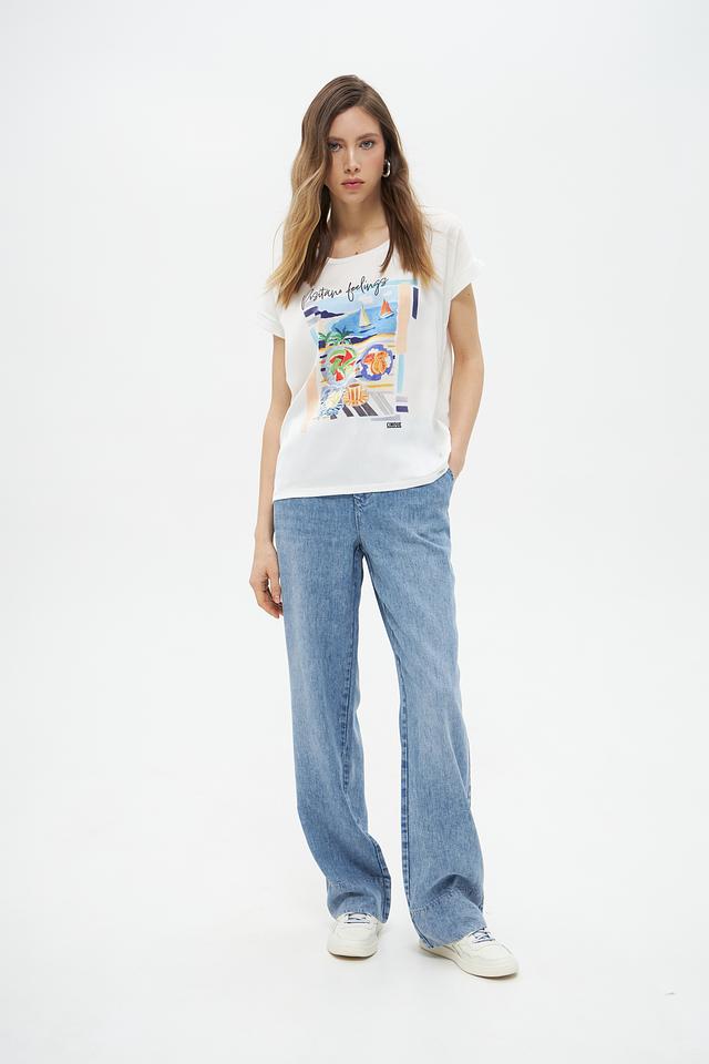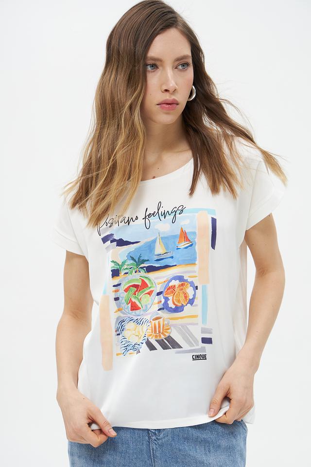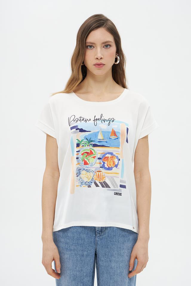 Белая футболка Cinque с ярким принтом "Positano feelings". Изготовлена из 100% хлопка, обеспечивающего комфорт и воздухопроницаемость. Идеальный выбор для создания летнего и стильного образа. Состав: хлопок 100%