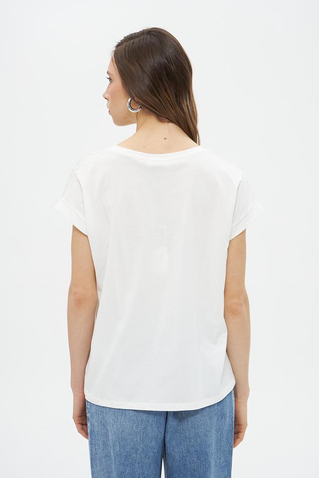Футболка имеет классический крой с короткими рукавами и круглым вырезом горловины. Она идеально подходит для повседневной носки и легко сочетается с различными элементами одежды, такими как джинсы, шорты или юбки.