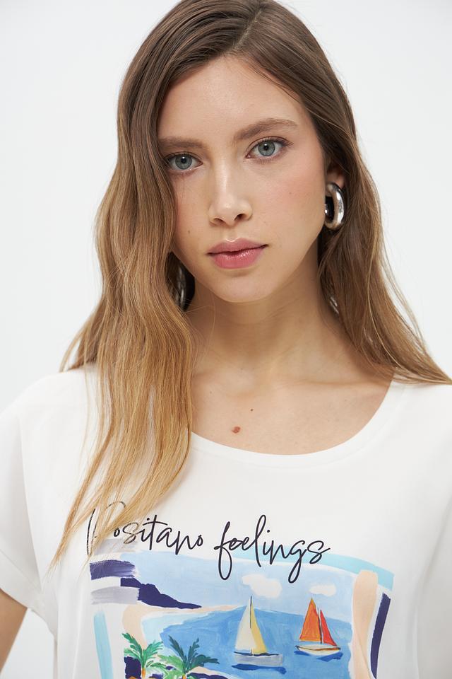 Особенностью данной модели является яркий и красочный принт "Positano feelings", изображающий морской пейзаж с пальмами, лодками и архитектурными элементами. Принт выполнен в насыщенных цветах, что делает футболку привлекательной и запоминающейся.