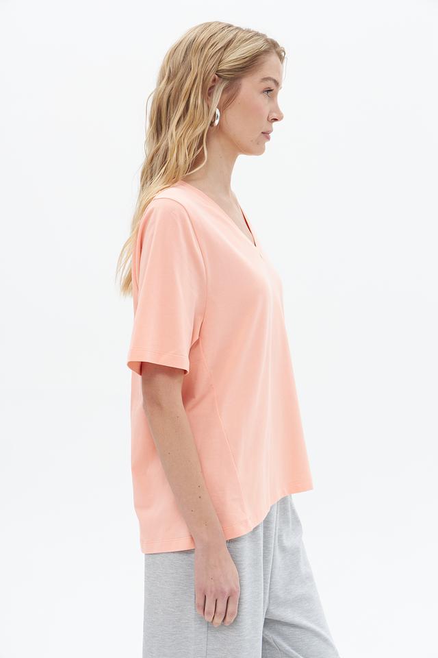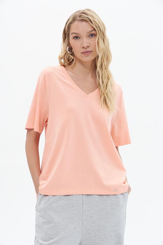 Женская футболка Cinque персикового цвета с V-образным вырезом и короткими рукавами. Изготовлена из мягкого хлопка с добавлением эластана для комфорта и свободы движений. Идеальный выбор для повседневного образа. Состав: хлопок 95%, эластан 5%