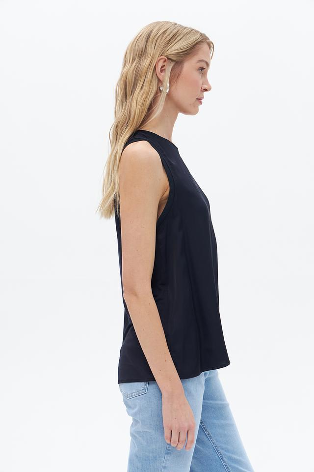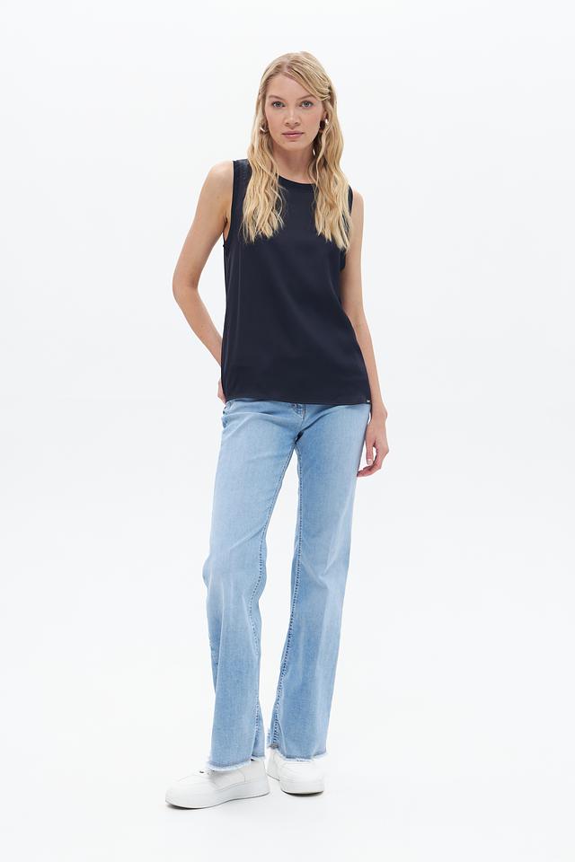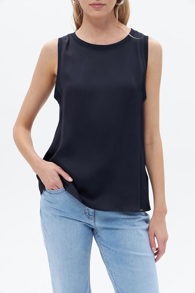 Топ имеет классический крой с круглым вырезом горловины и широкими бретелями, что делает его универсальным для различных типов фигур. Тёмно-синий цвет топа легко сочетается с другими элементами одежды, позволяя создавать разнообразные образы.