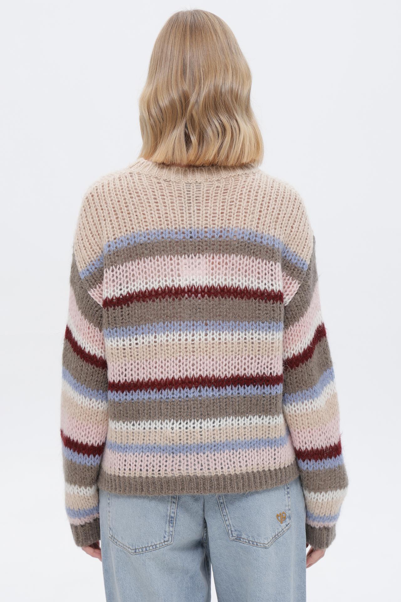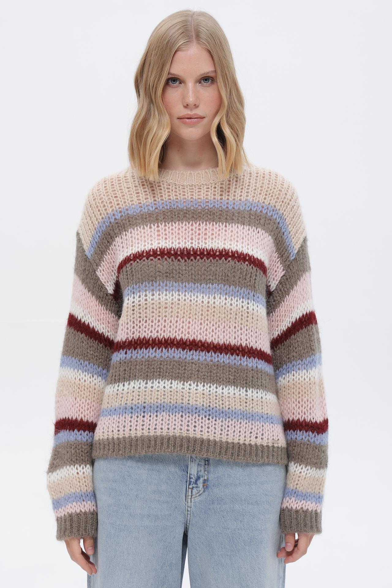 - Дизайн: Классический свитер в горизонтальную полоску. Полосы выполнены в сочетании бежевых, коричневых, розовых, голубых и бордовых оттенков, создавая эффектный и модный вид.
