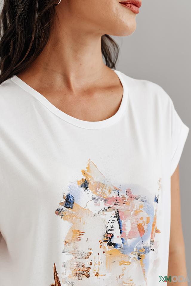 Особенностью данной модели является яркий и необычный абстрактный принт, который добавляет образу оригинальности и стиля. Футболка имеет классический крой с короткими рукавами и округлым вырезом горловины, что делает ее универсальной и подходящей для различных случаев.