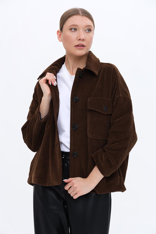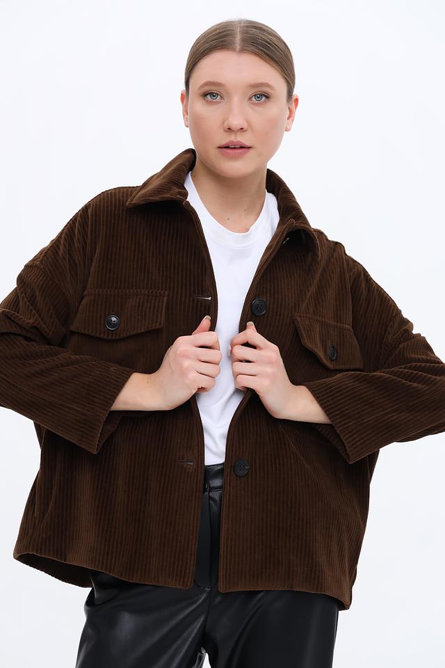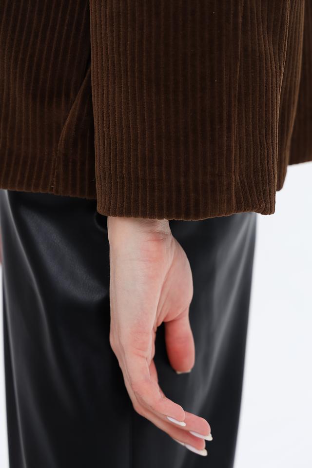 Этот жакет от Circolo 1901 выполнен из плотного вельвета в рубчик коричневого оттенка. Прямой крой и лацканы придают модели классический вид, а накладные карманы добавляют функциональности.