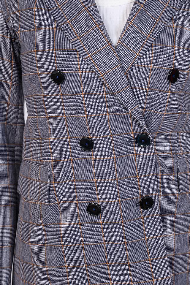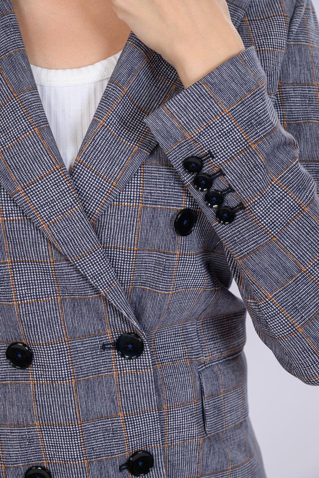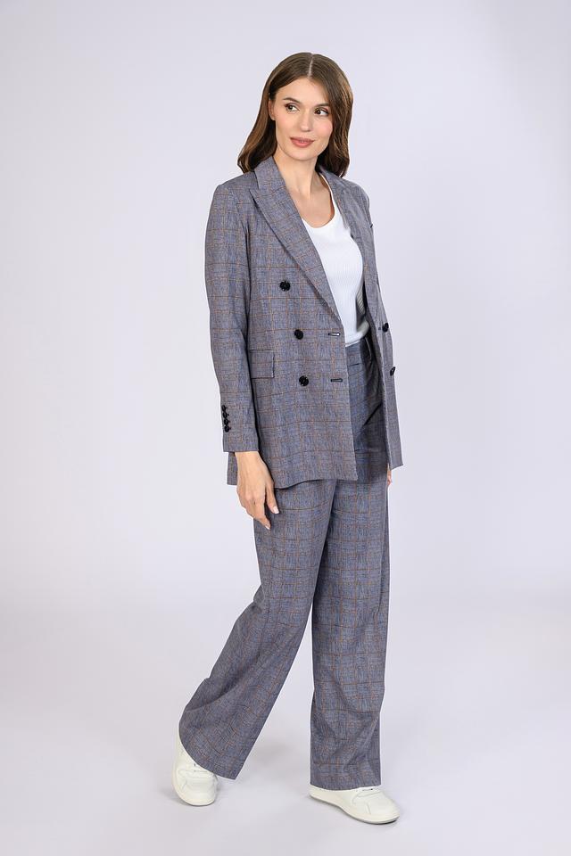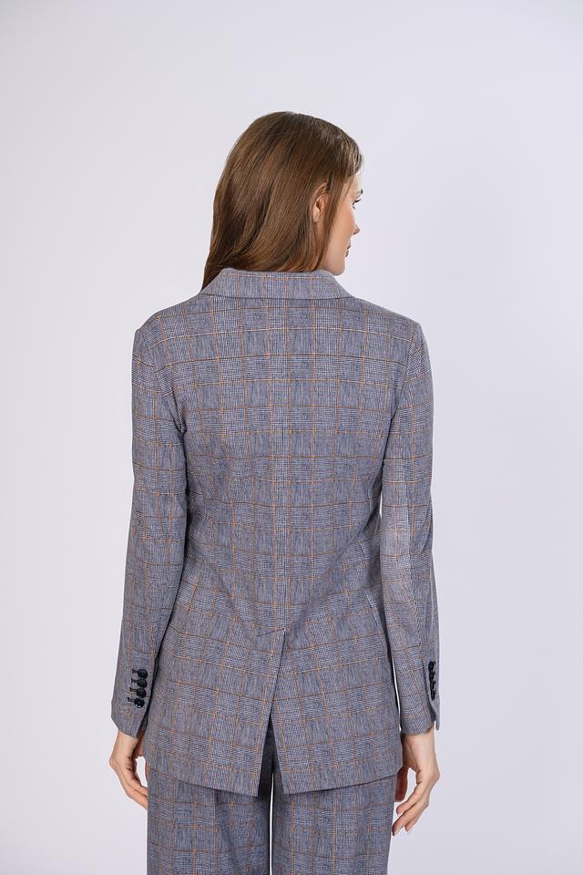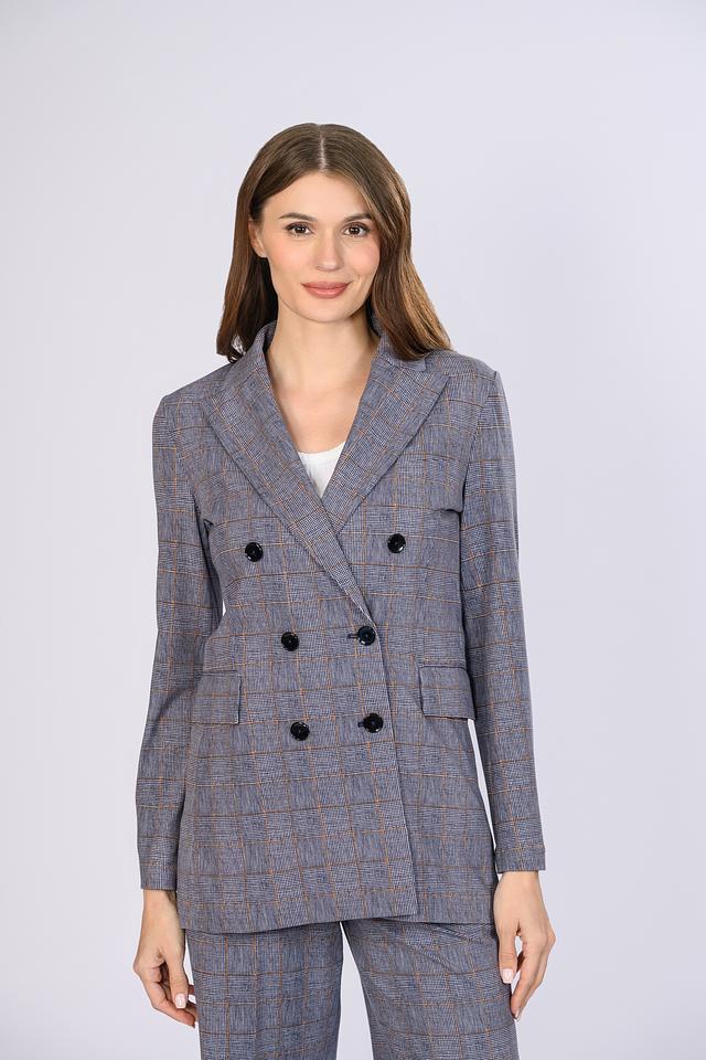 Жакет имеет двубортную застёжку на пуговицы, лацканы стандартной ширины и два функциональных кармана с клапанами. Прямой крой обеспечивает комфортную посадку по фигуре, а слегка удлинённый силуэт визуально стройнит.