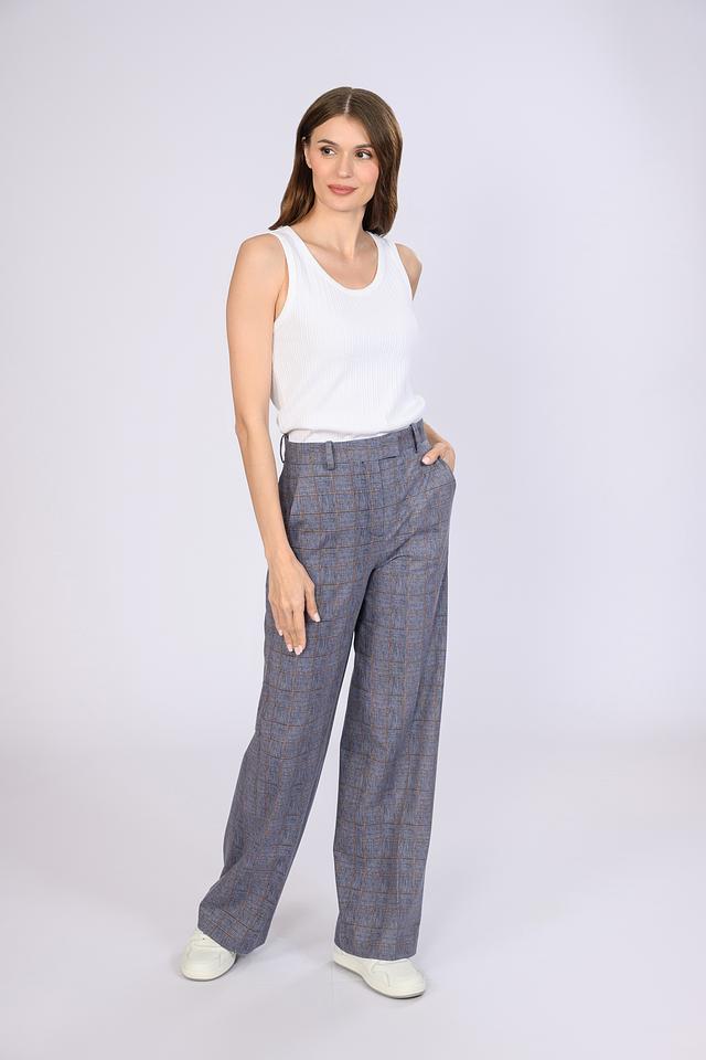 Брюки имеют прямой крой и широкие штанины, что обеспечивает комфорт и свободу движений. Высокая посадка подчеркивает талию и создает элегантный силуэт. Застежка на молнию и пуговицу обеспечивает надежную фиксацию.