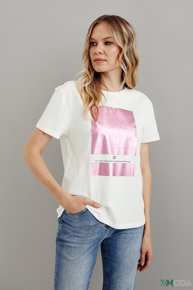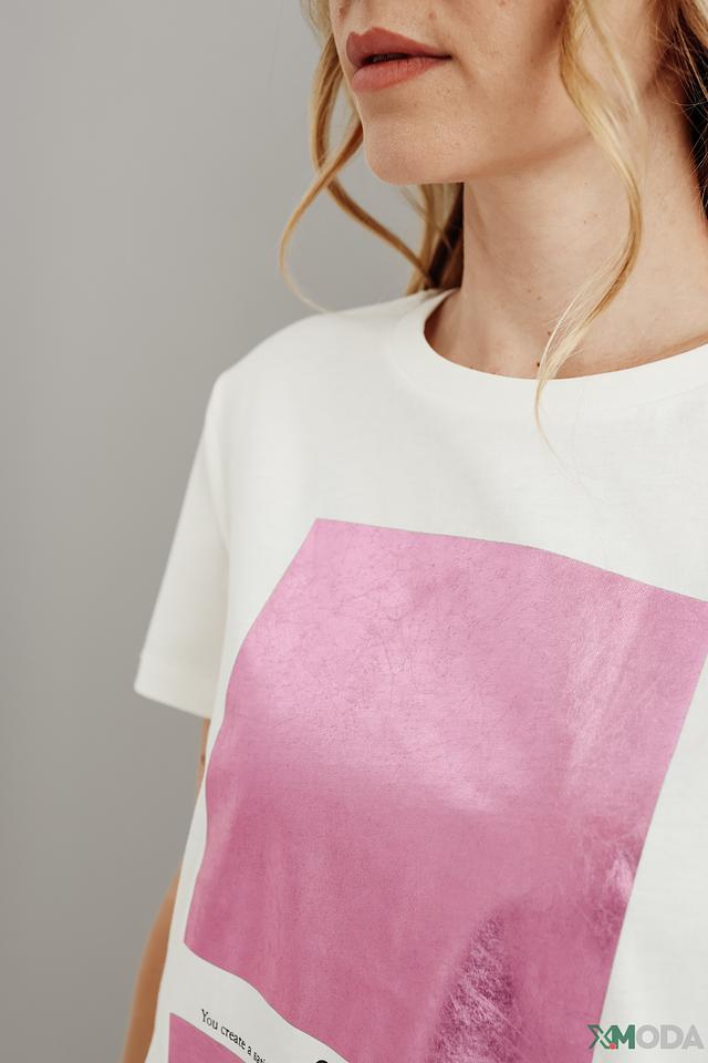 Основной цвет футболки – белый, который служит идеальным фоном для яркого и привлекательного розового принта. Принт выполнен в виде абстрактного изображения, добавляющего современности и оригинальности.