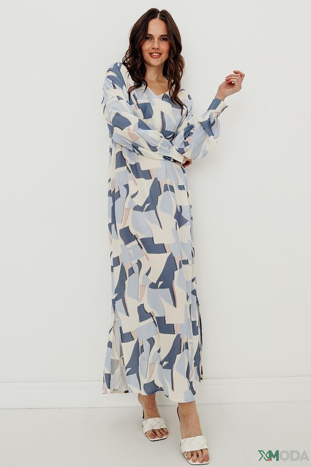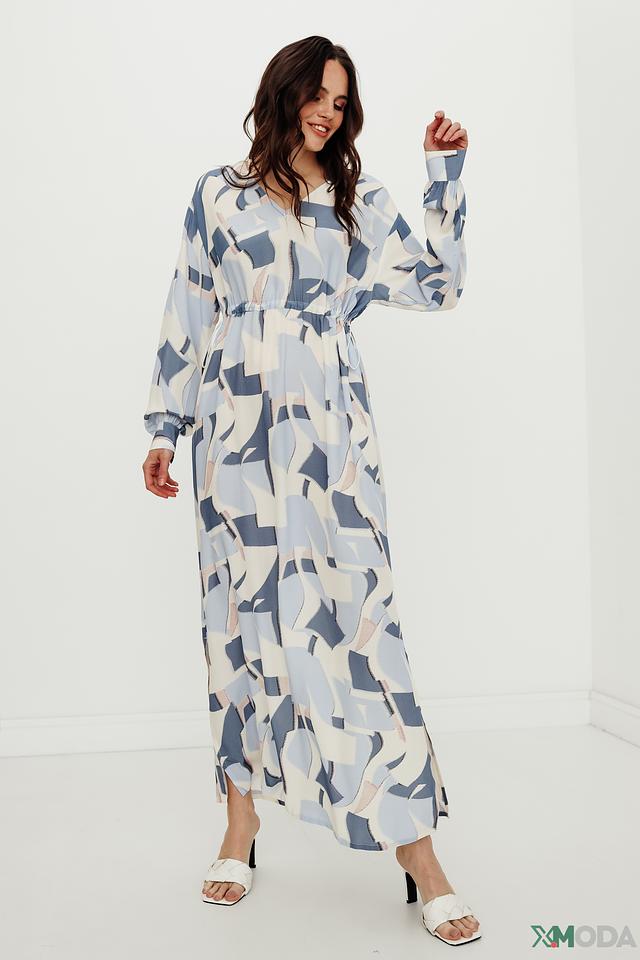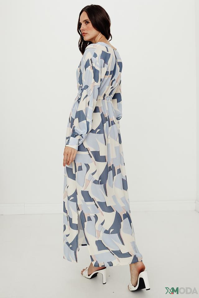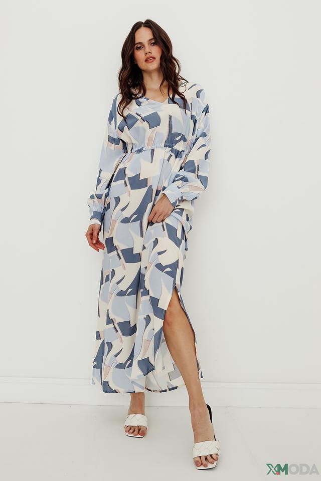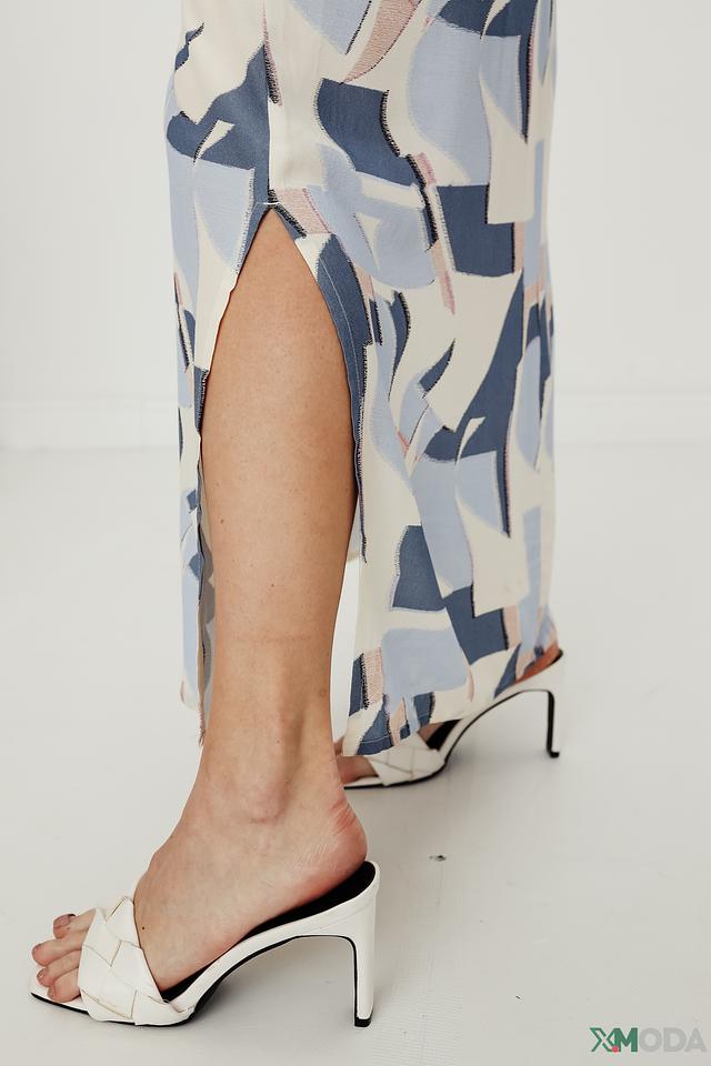 Особенностью этого платья является оригинальный абстрактный принт в светло-голубой, бежевой и серой цветовой гамме. Пояс подчеркивает талию и создает женственный силуэт. Разрез спереди добавляет образу легкости и непринужденности.