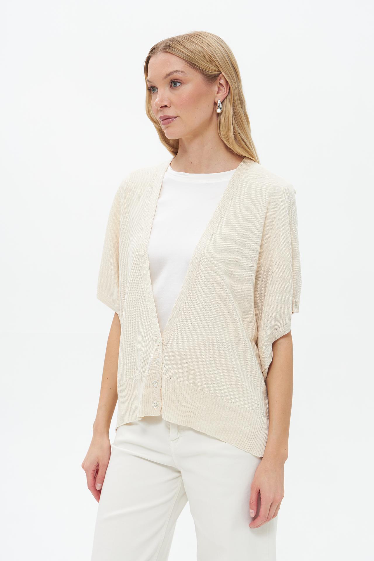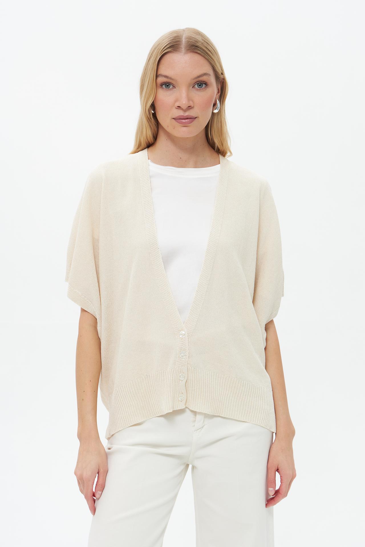 - Дизайн: Классический V-образный вырез и застежка на перламутровые пуговицы подчеркивают элегантность модели. Широкие манжеты и низ в рубчик добавляют изящества этой женской одежде.