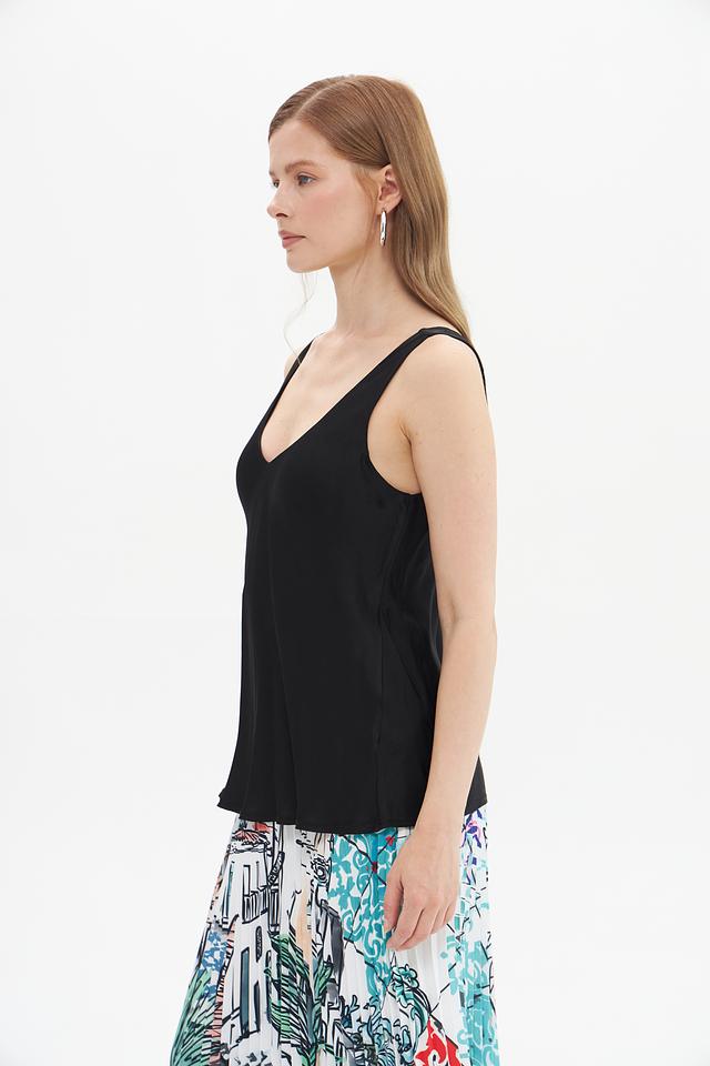 Топ имеет лаконичный дизайн с V-образным вырезом и тонкими бретелями, что делает его универсальным для различных стилей. Его можно сочетать с джинсами, юбками или брюками, создавая как повседневные, так и более элегантные образы.