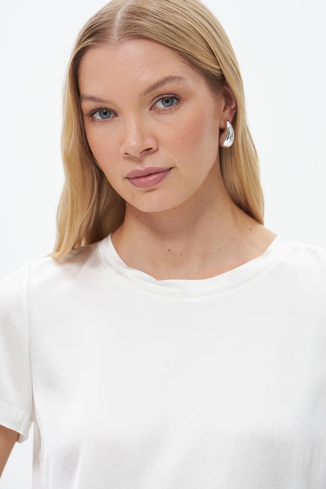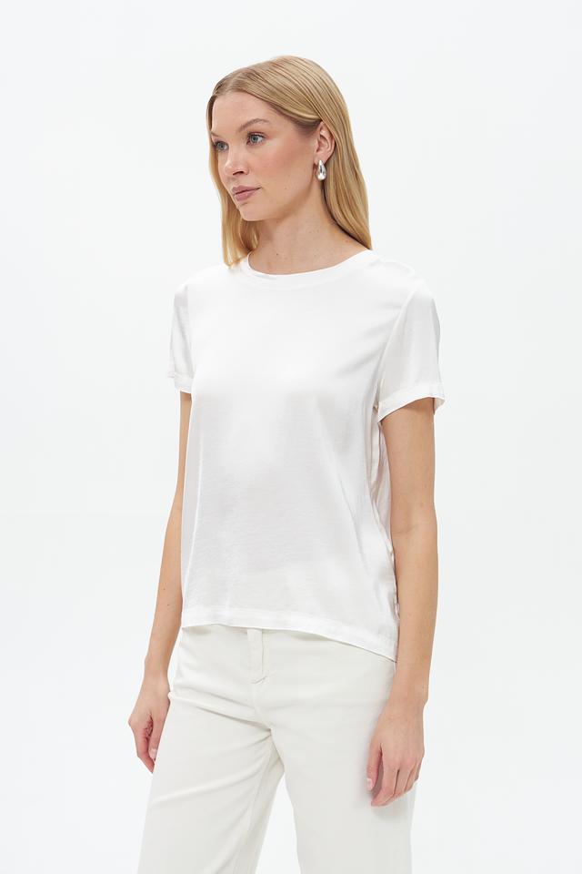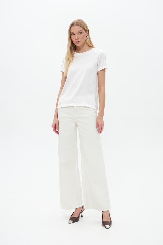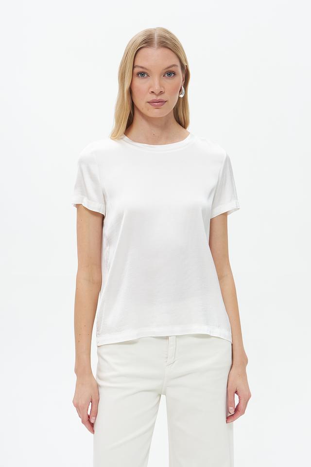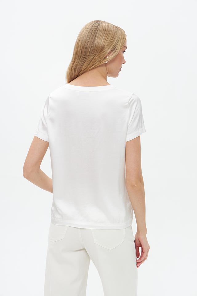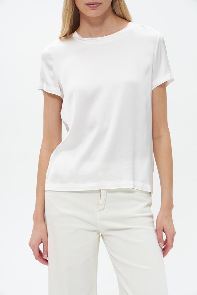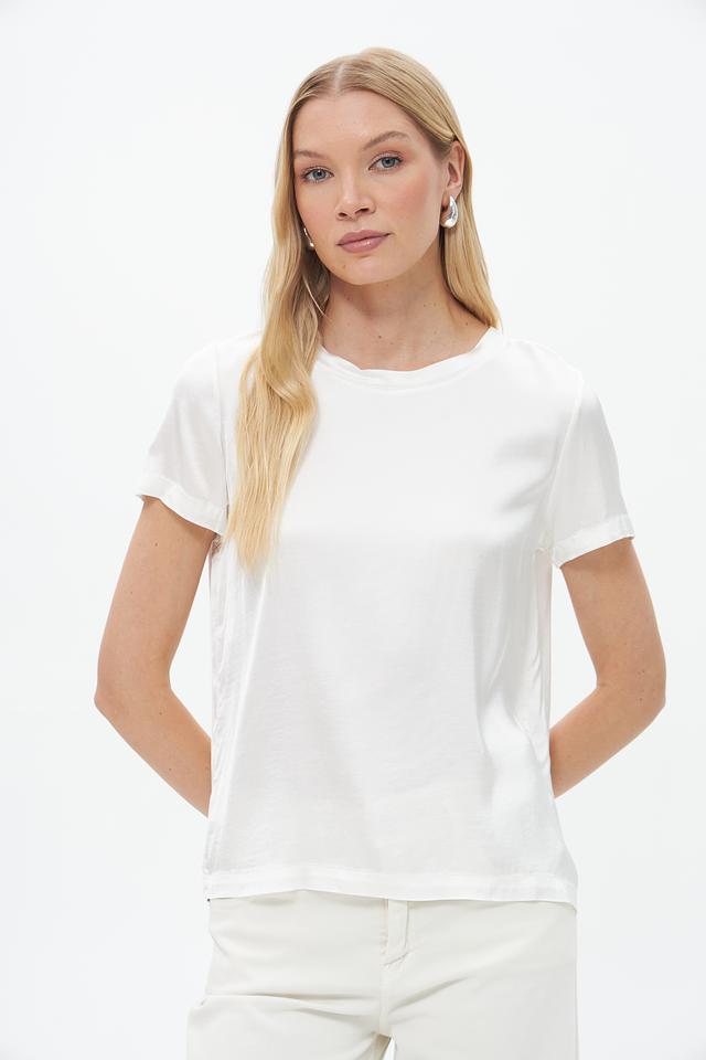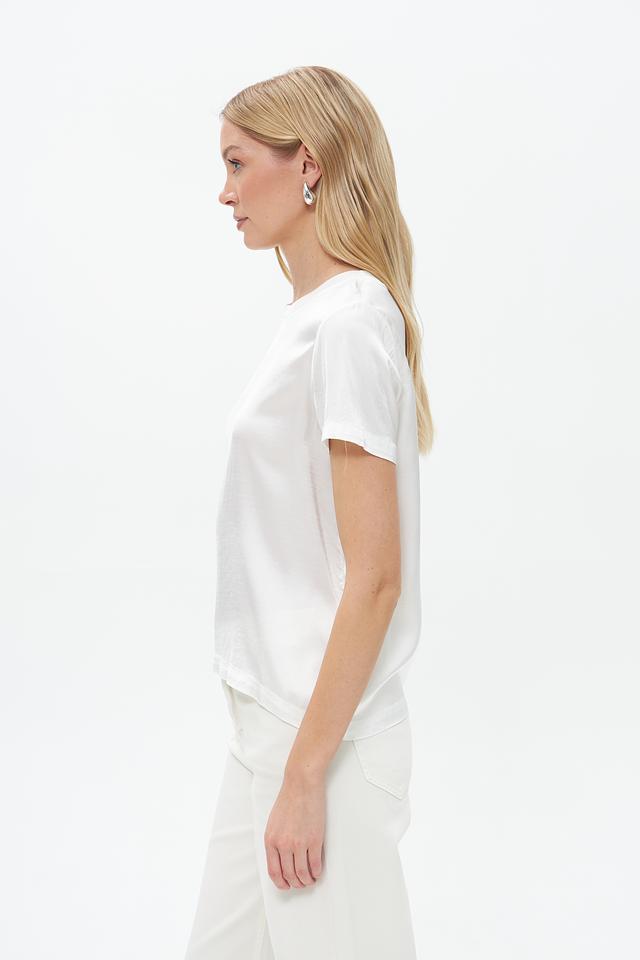 Блуза имеет прямой крой, короткие рукава и классический круглый вырез горловины. Белый цвет делает ее универсальной и легко сочетаемой с различными элементами одежды.
