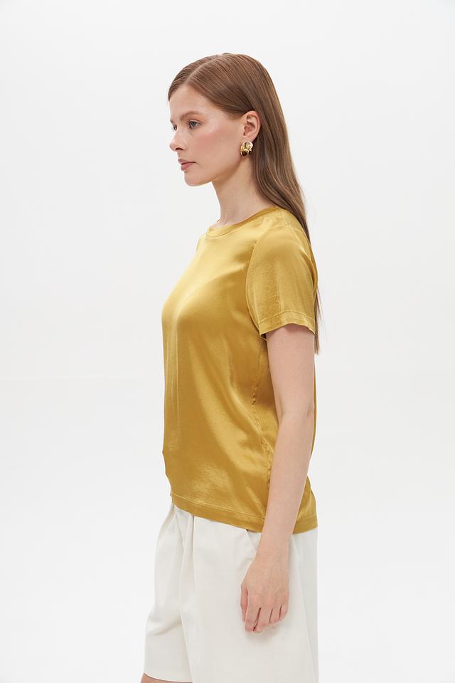 Блуза имеет классический крой с короткими рукавами и круглым вырезом горловины. Ее золотистый оттенок придает образу элегантность и изысканность. Сатиновый эффект ткани создает легкий блеск, который подчеркивает благородство изделия.