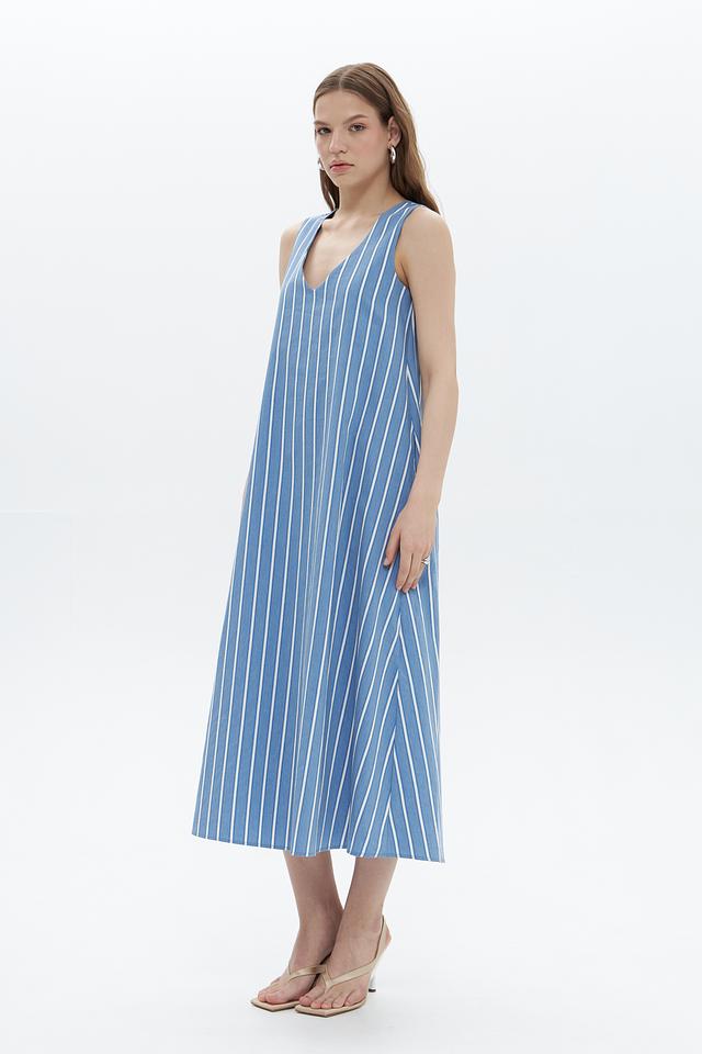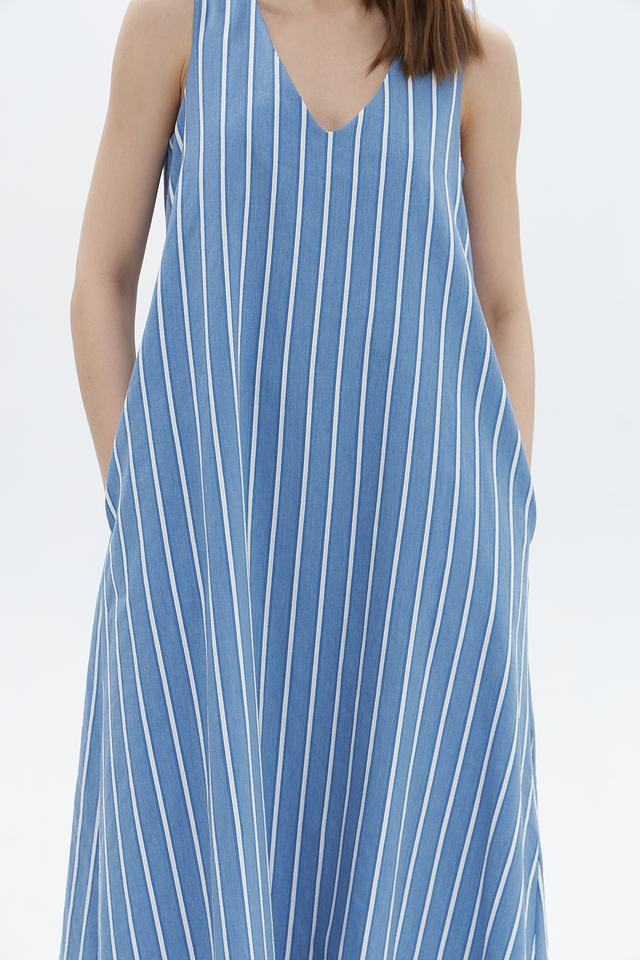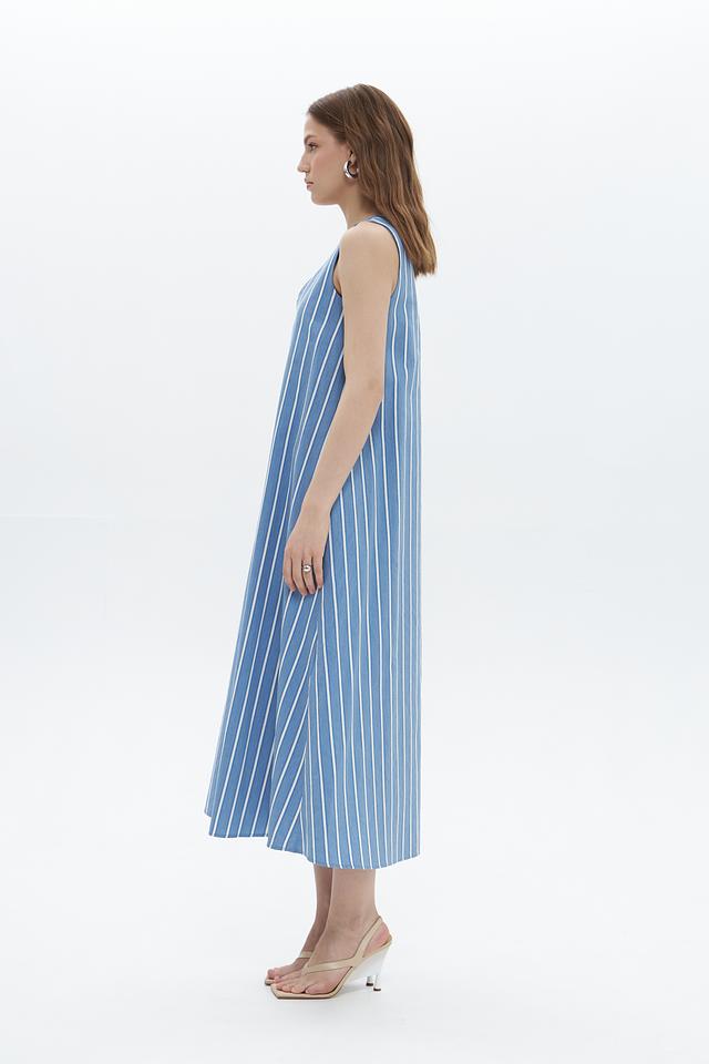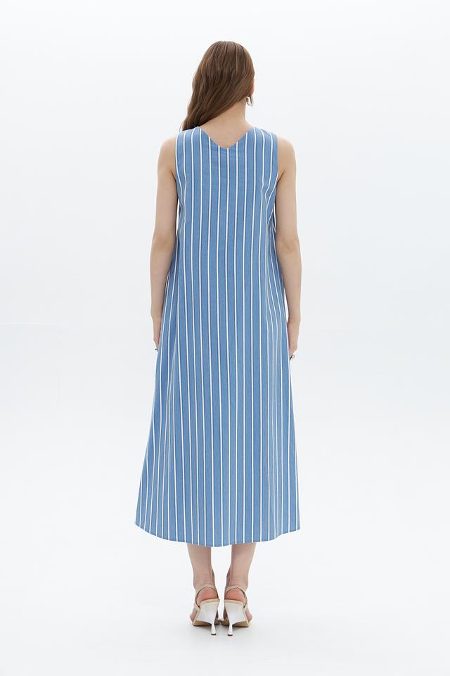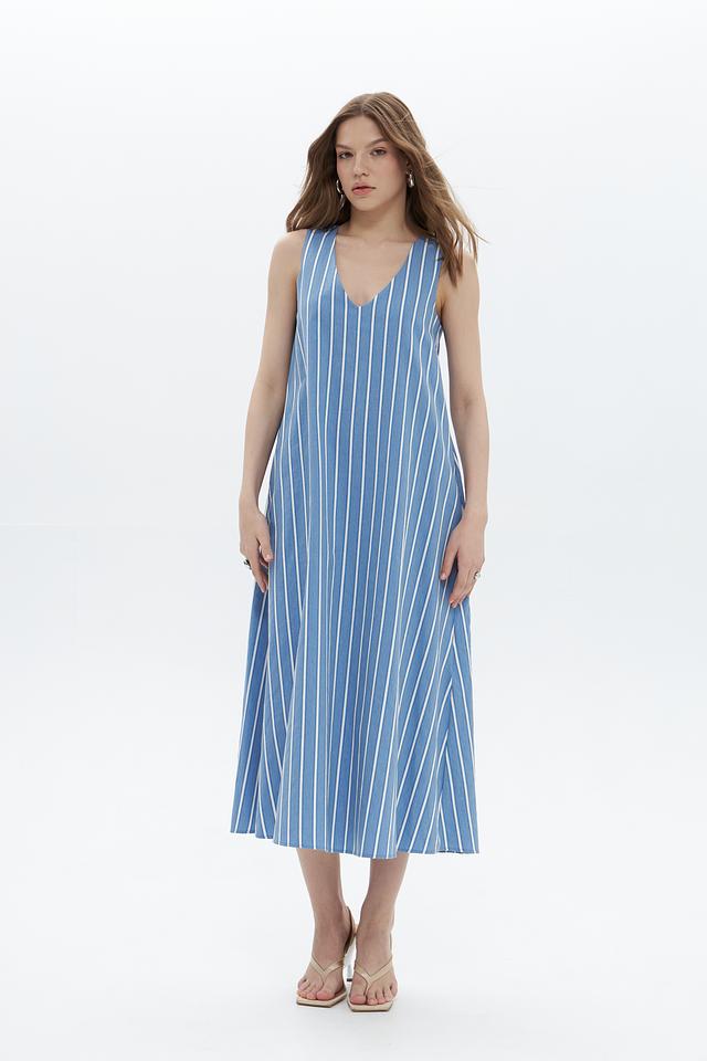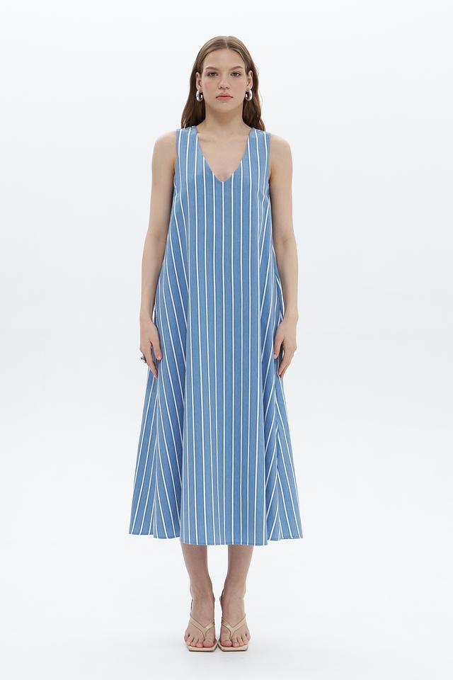 Это платье от Croche выполнено в лёгком и воздушном стиле, идеально подходящем для тёплой погоды. Преобладающий цвет – голубой, дополненный белыми вертикальными полосами, создающими визуально вытягивающий силуэт.