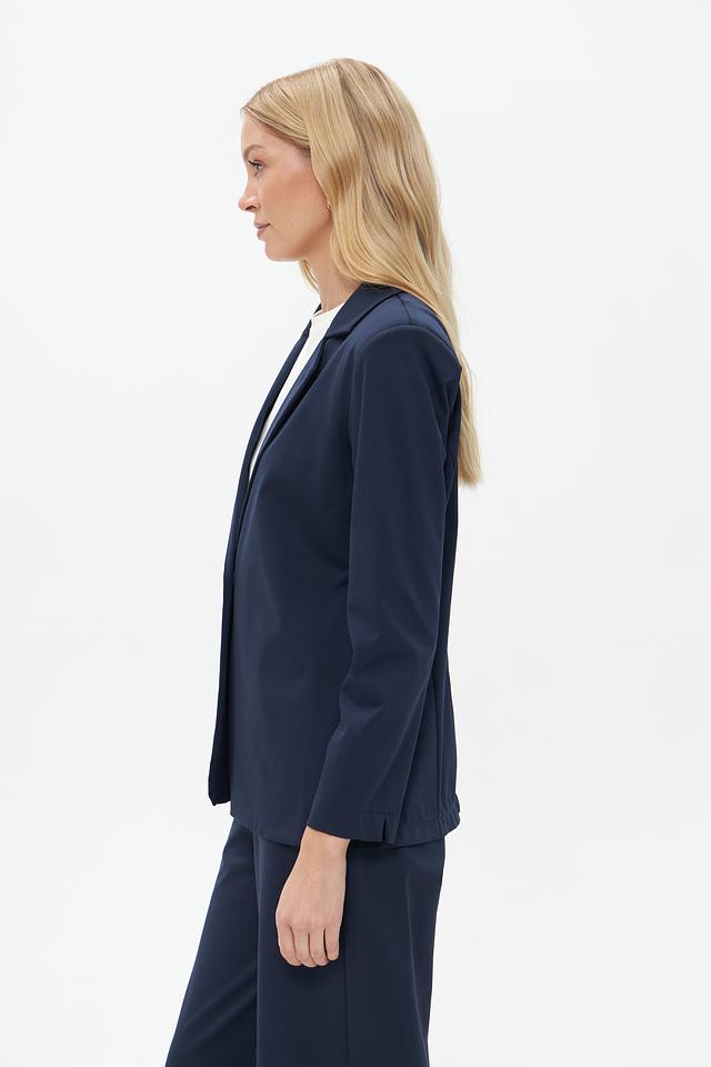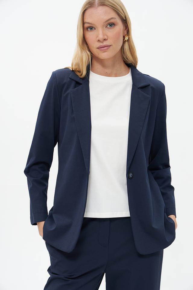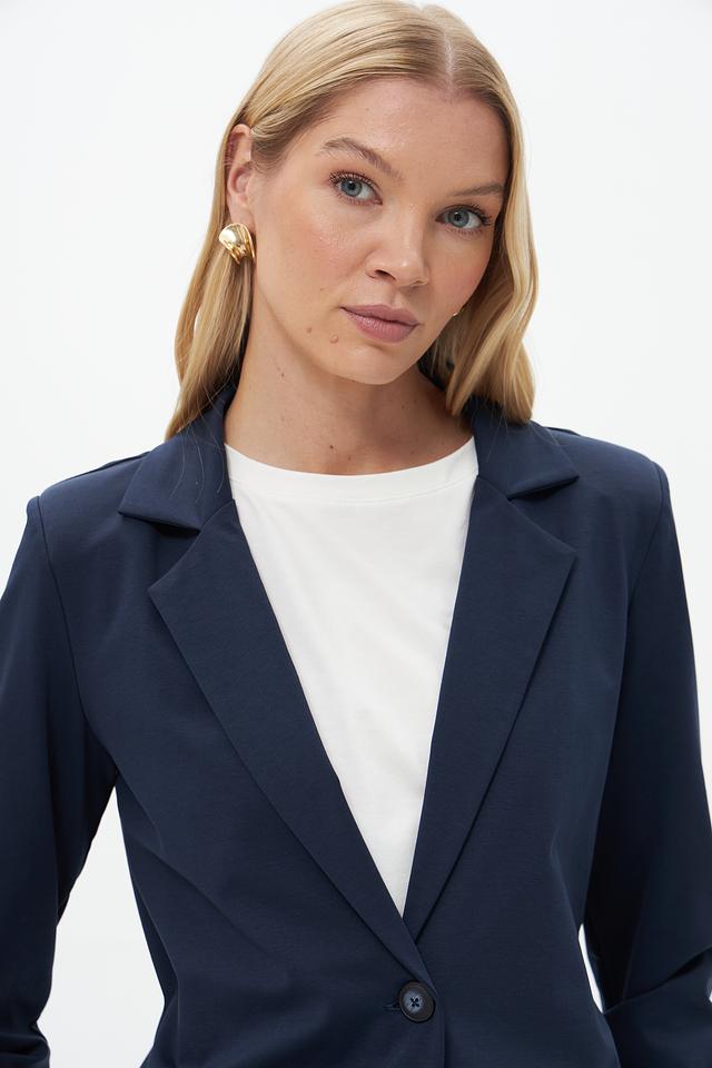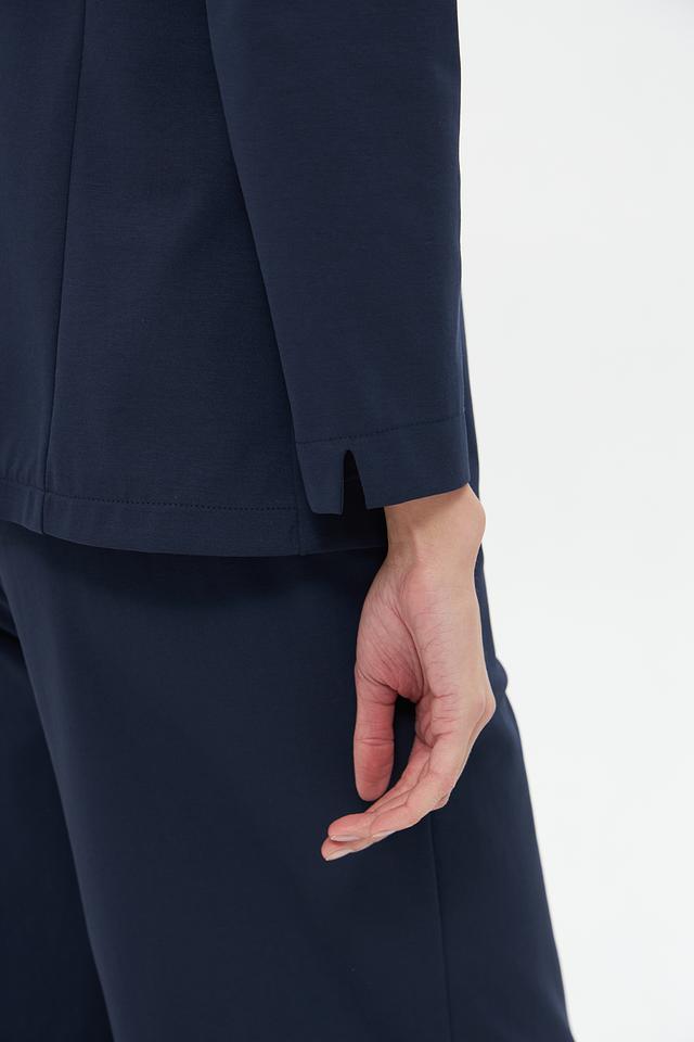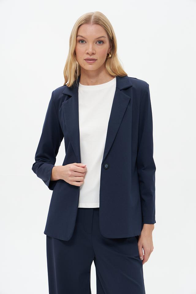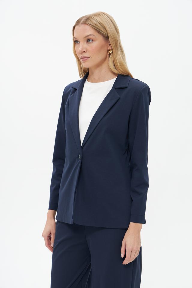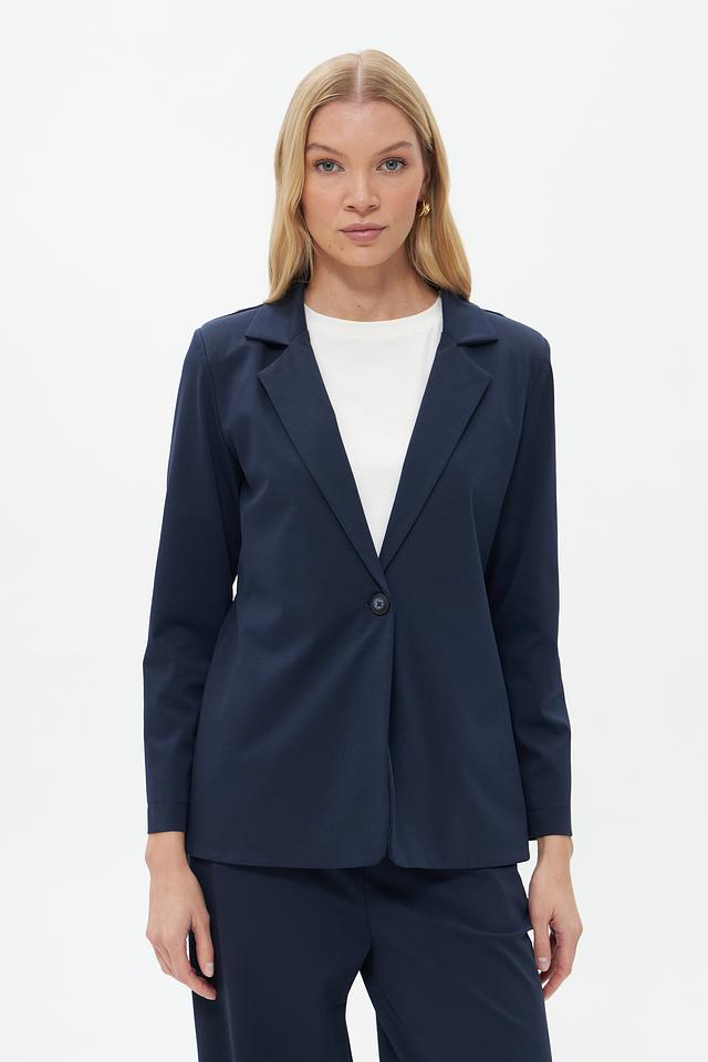 Жакет имеет приталенный силуэт, который подчеркивает фигуру, и однобортную застежку на одну пуговицу. Воротник пиджачного типа добавляет образу строгости и элегантности. Длинные рукава с манжетами.