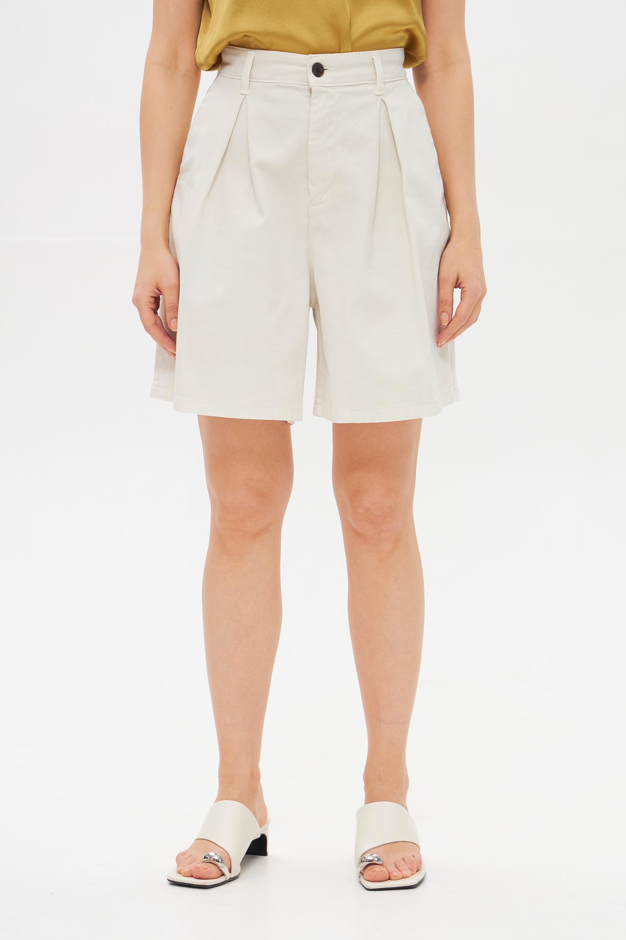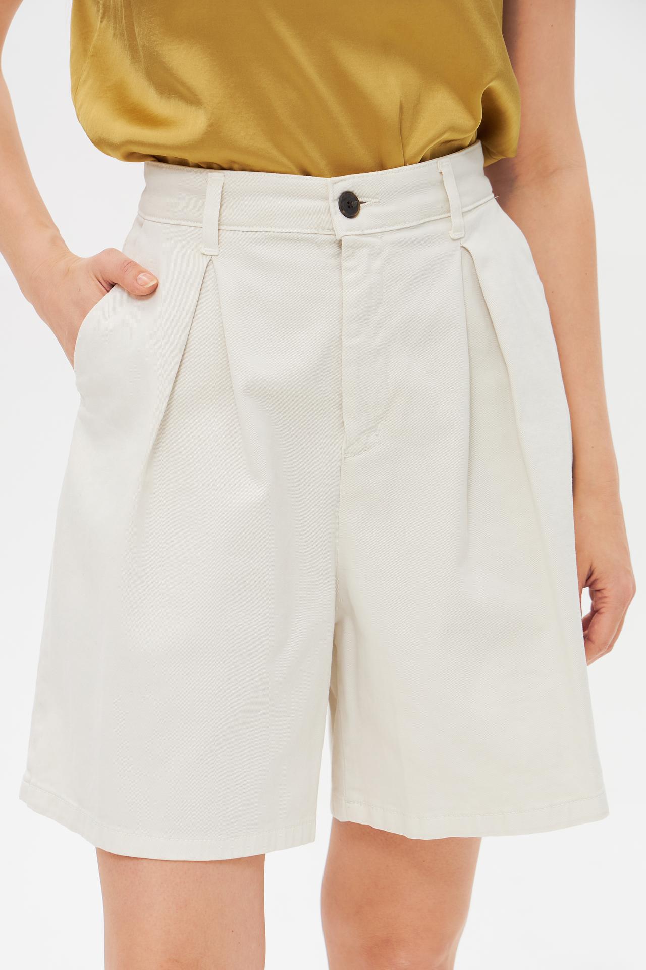 - Свободный крой и защипы: Широкий крой и стильные защипы на передней части обеспечивают свободу движений и добавляют модели элегантности. Это придает шортам актуальный и расслабленный вид.