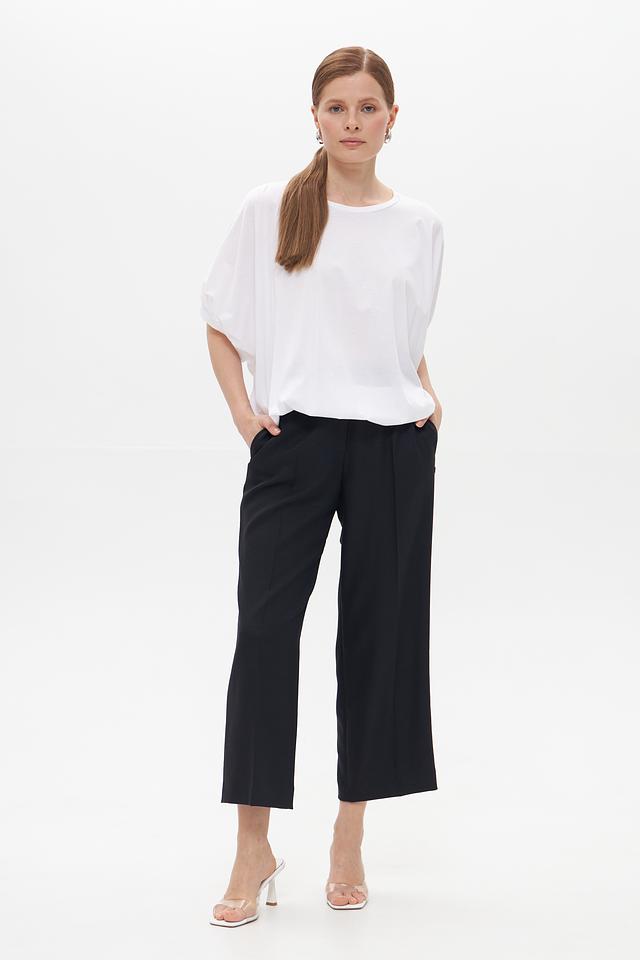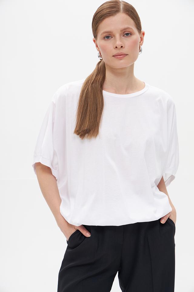 Футболка имеет свободный крой и короткий рукав-фонарик, который придает ей особый шарм и легкость. Округлый вырез горловины подчеркивает женственность силуэта. Минималистичный дизайн позволяет сочетать эту футболку с различными элементами одежды, создавая разнообразные образы.