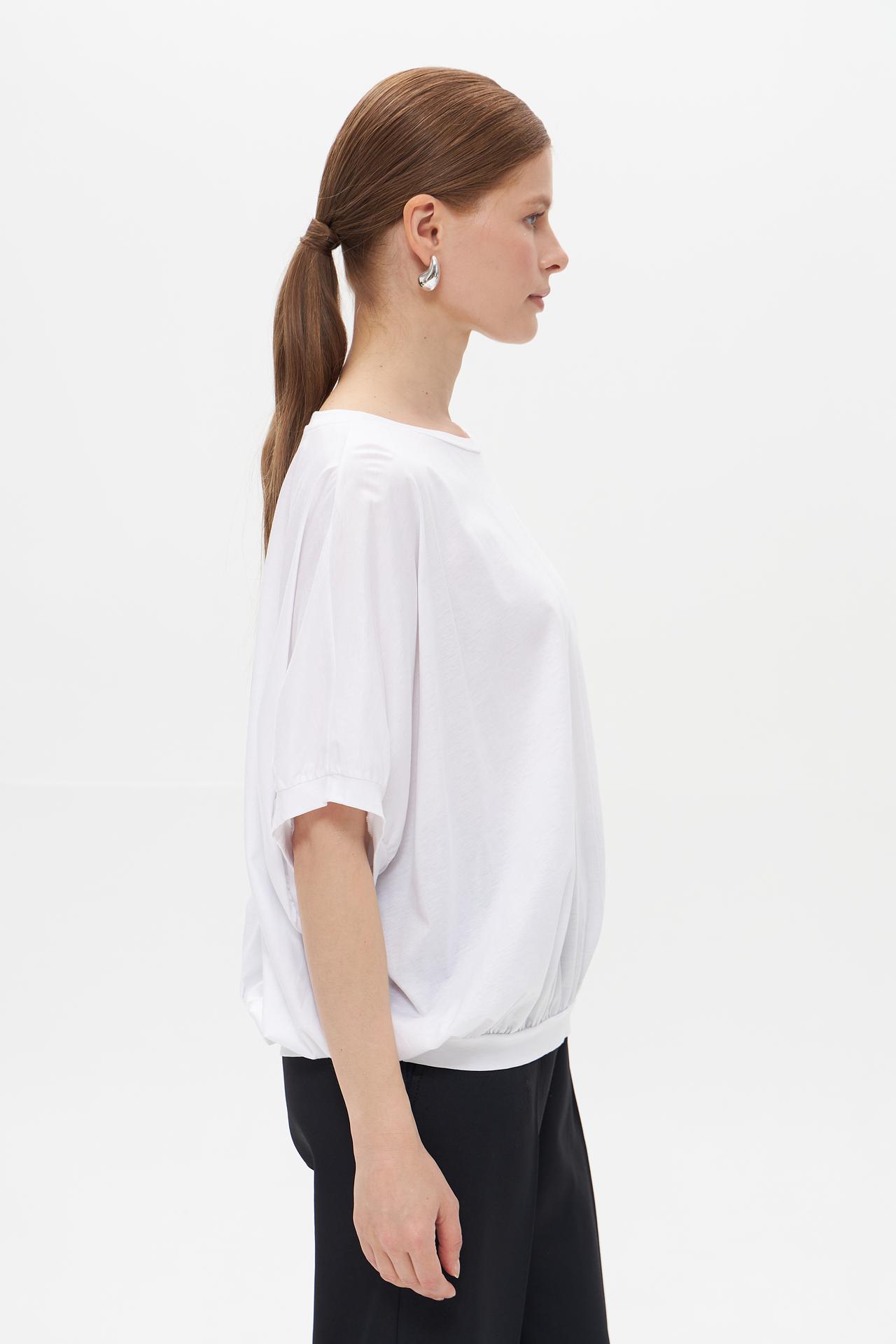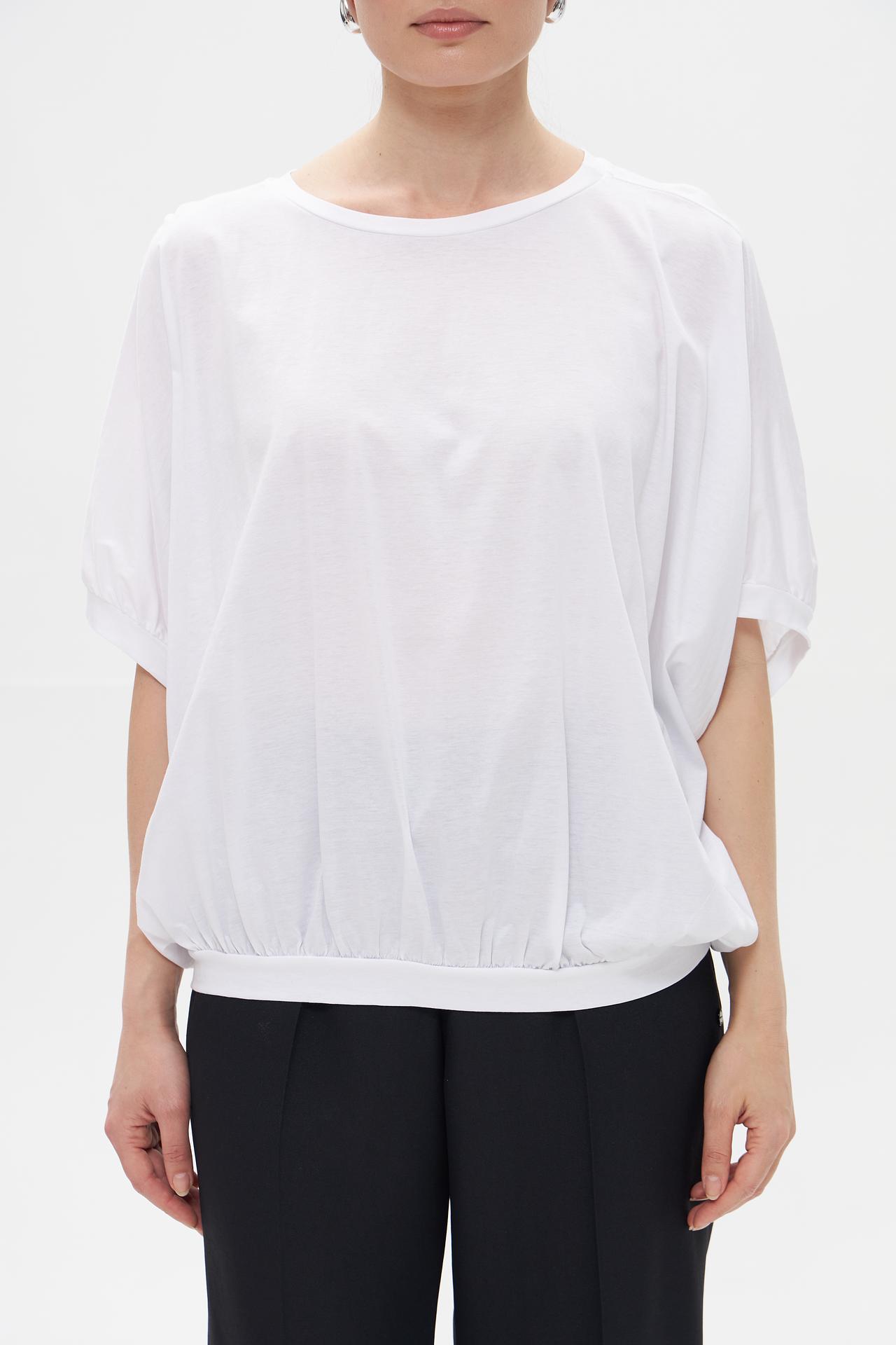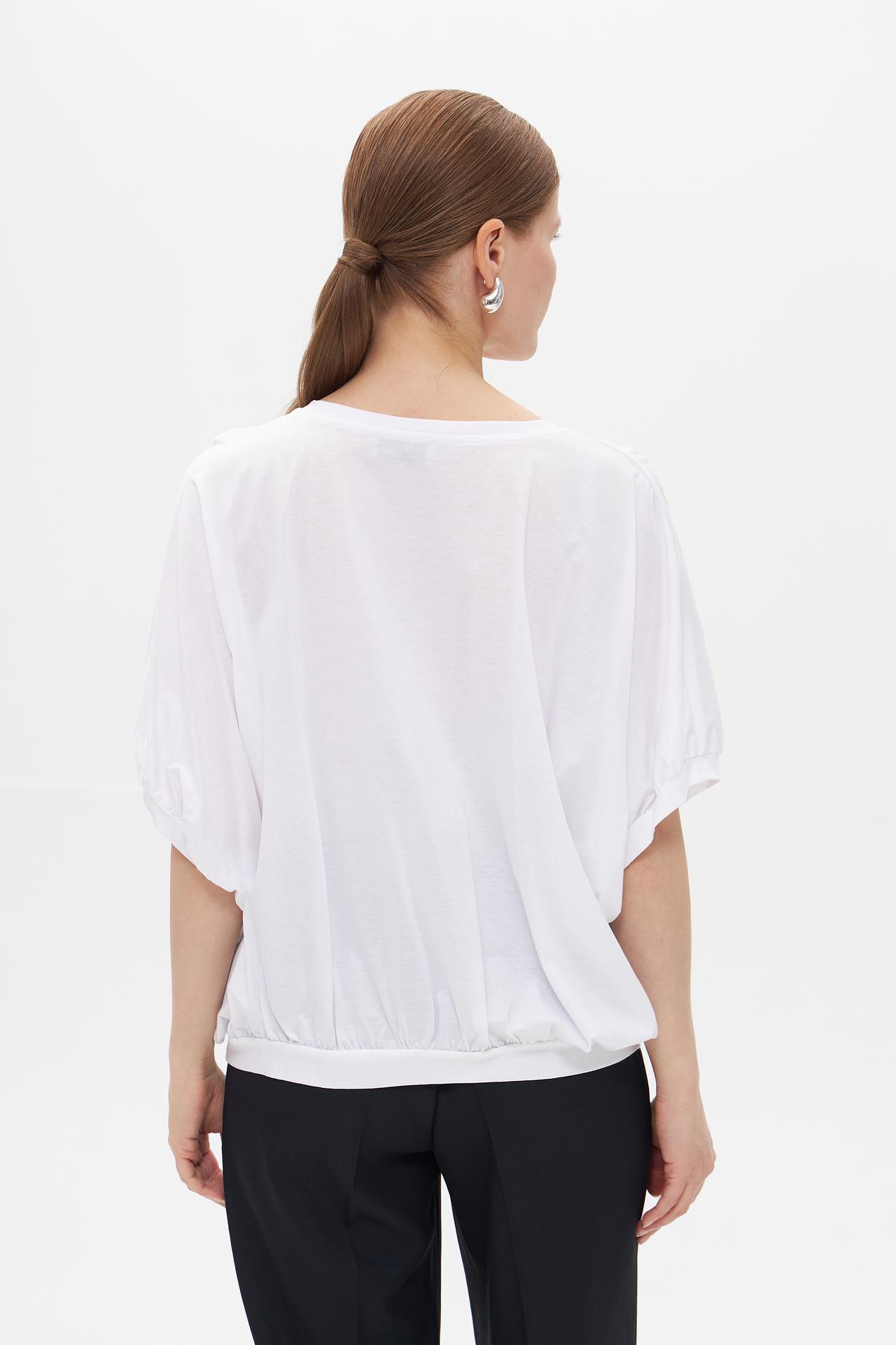 Свободный крой оверсайз и объемные рукава на эластичной резинке создают современный и непринужденный образ. Низ изделия также собран на резинку, что позволяет красиво драпировать футболку и регулировать длину. Круглый вырез горловины добавляет универсальности, позволяя легко сочетать футболку Croche как с джинсами, так и с классическими брюками или юбками.