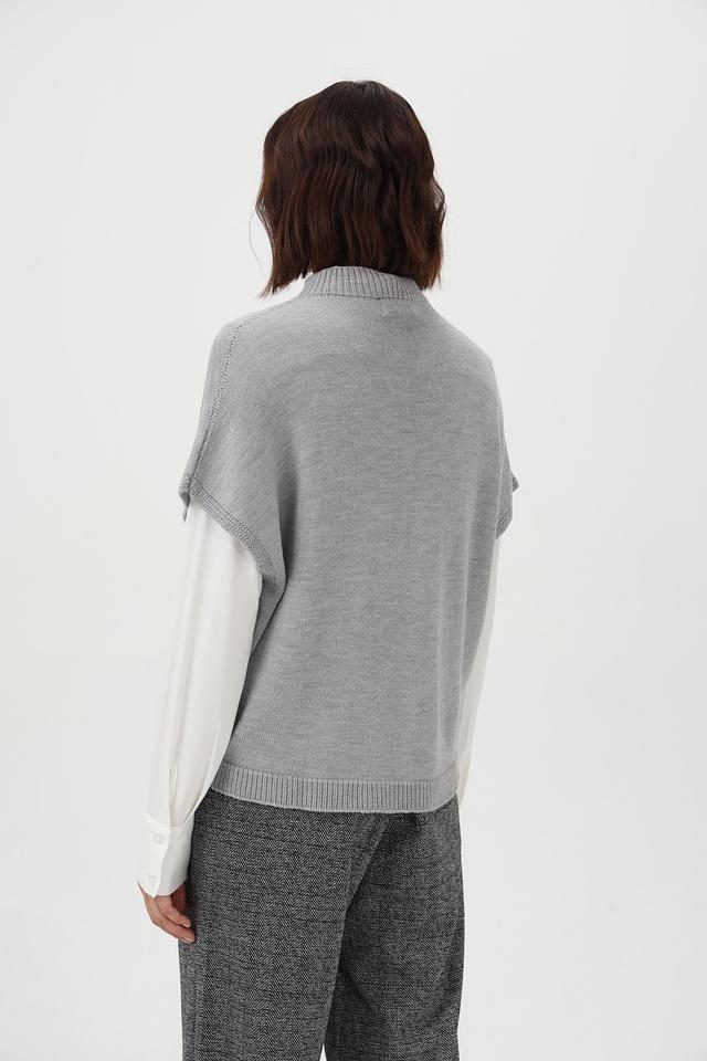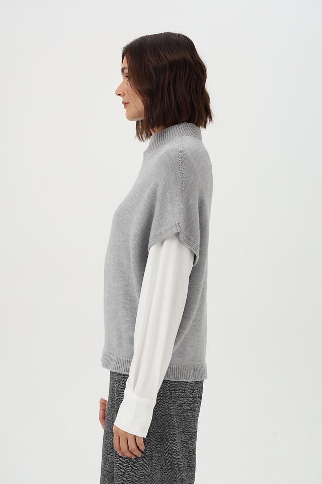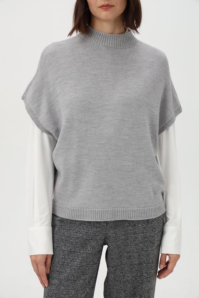 Жилет имеет прямой крой и высокий ворот, что придает ему элегантный вид. Изготовлен из мягкого трикотажа, обеспечивающего комфорт при носке. Модель без рукавов позволяет создавать многослойные образы.