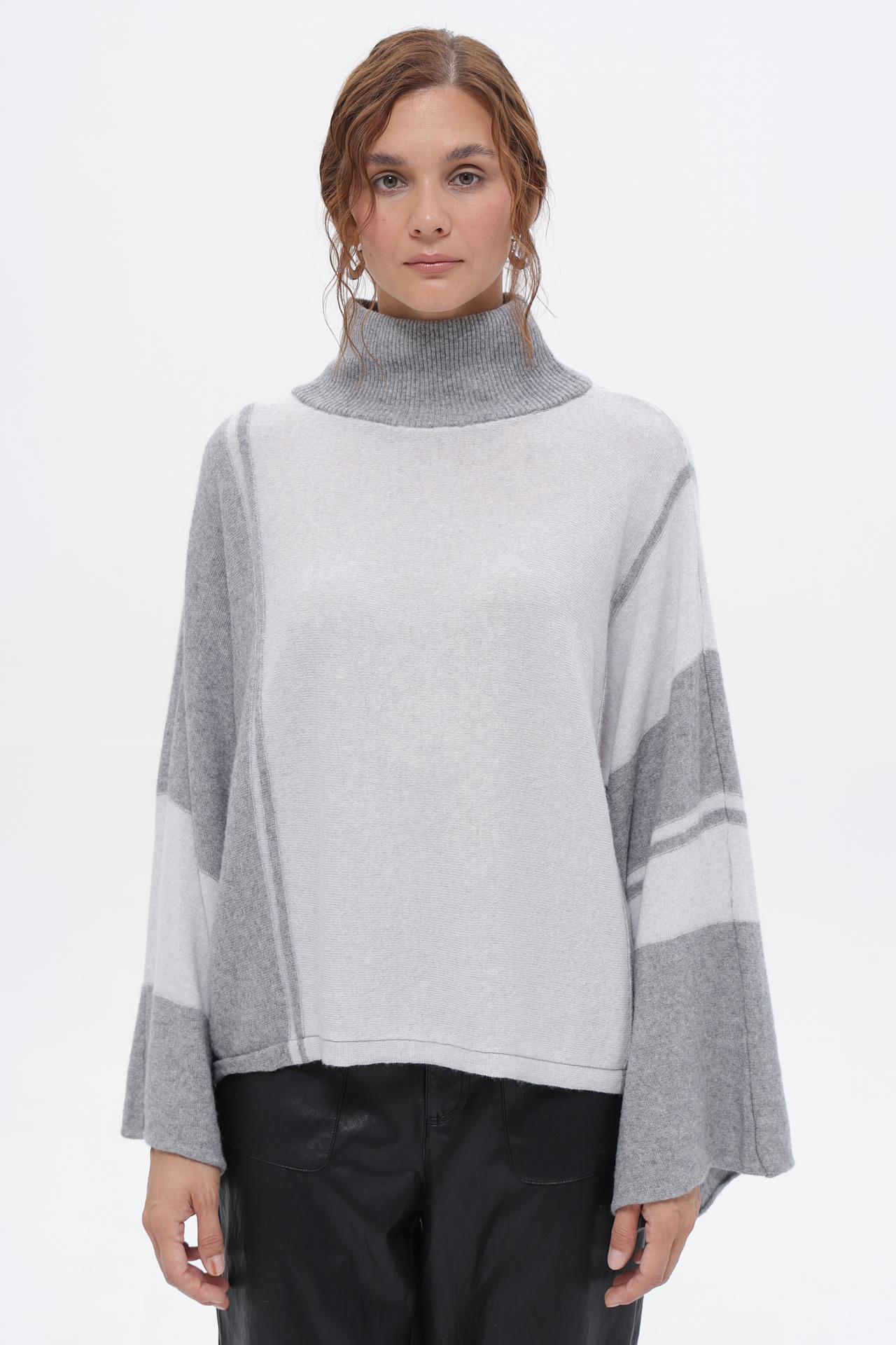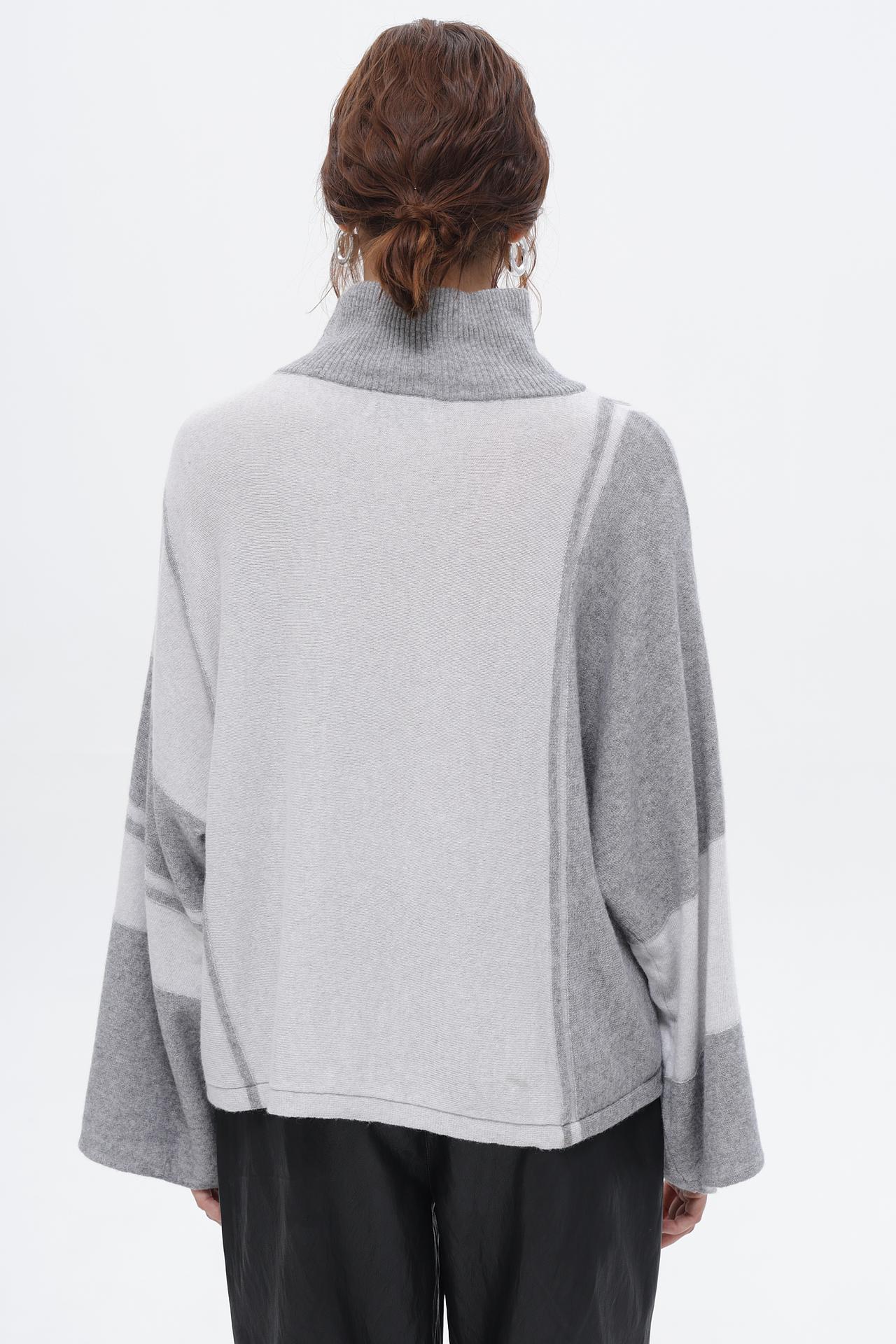 - Дизайн: Пуловер свободного кроя с высоким воротником и рукавами-клеш. Акцент сделан на геометрические вставки разных оттенков серого, создающие стильный контраст.