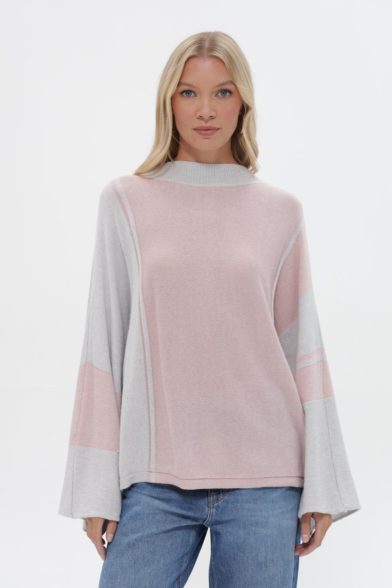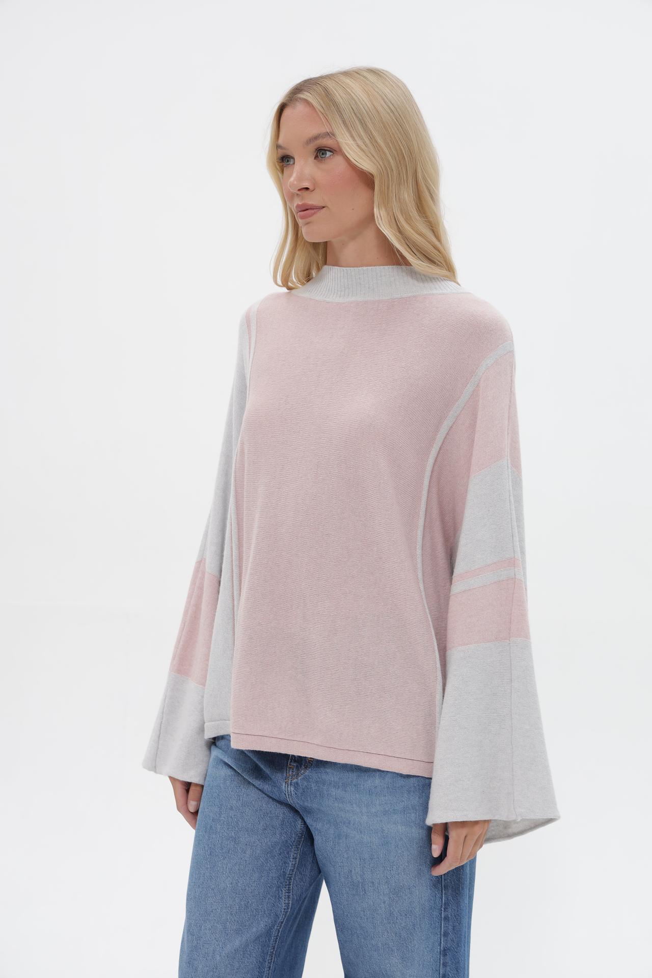 - Дизайн: Пуловер отличается современным дизайном с блоками контрастных цветов и декоративными швами, подчеркивающими его структуру. Широкие рукава-клеш добавляют образу легкости и элегантности.