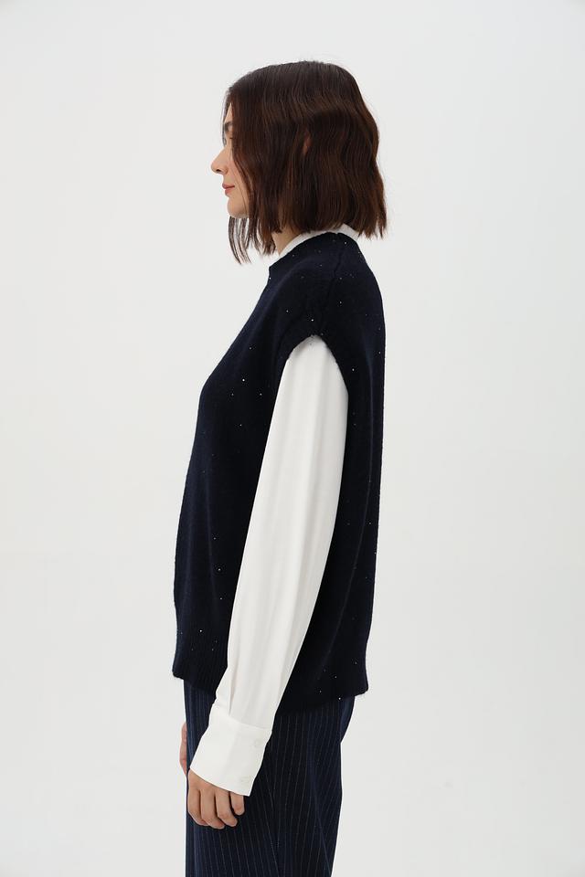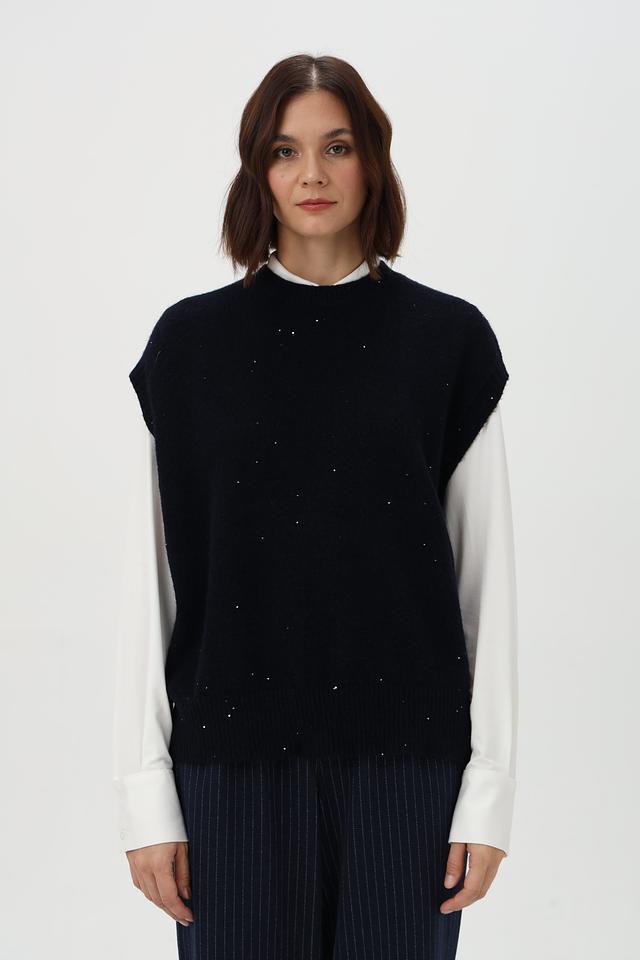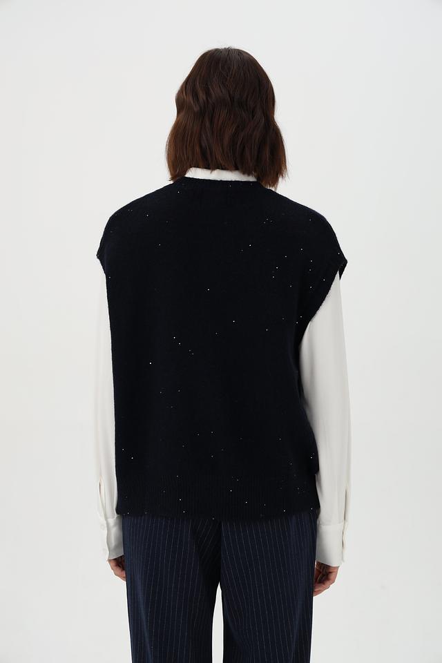 Жилет имеет свободный крой и округлый вырез, что обеспечивает комфортную посадку по фигуре. Декоративная вышивка в виде мелких точек добавляет изделию изысканности и оригинальности.
