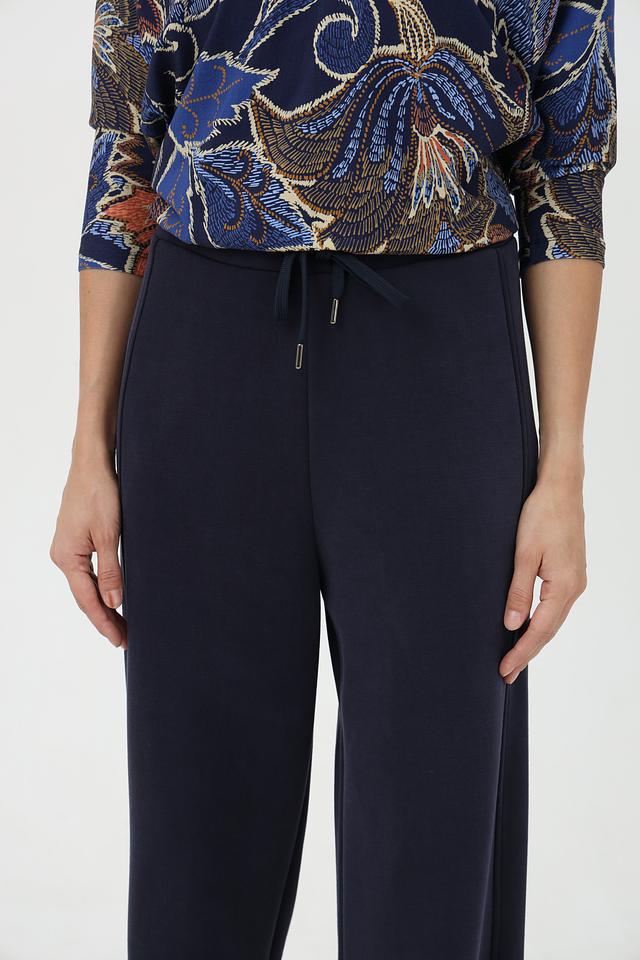 Темно-синие брюки Croche с завязками на поясе — отличный выбор для создания комфортного и стильного образа. Модель выполнена из мягкой ткани, сочетающей в себе вискозу, полиэстер и эластан. Состав: полиэстер 49%, вискоза 44%, эластан 7%